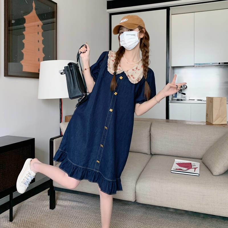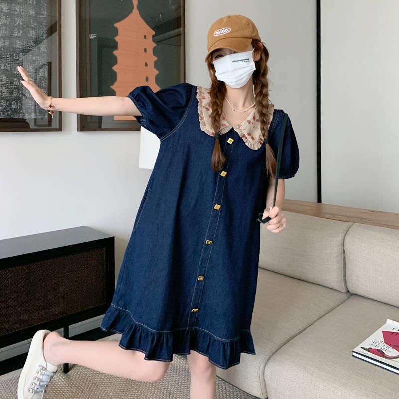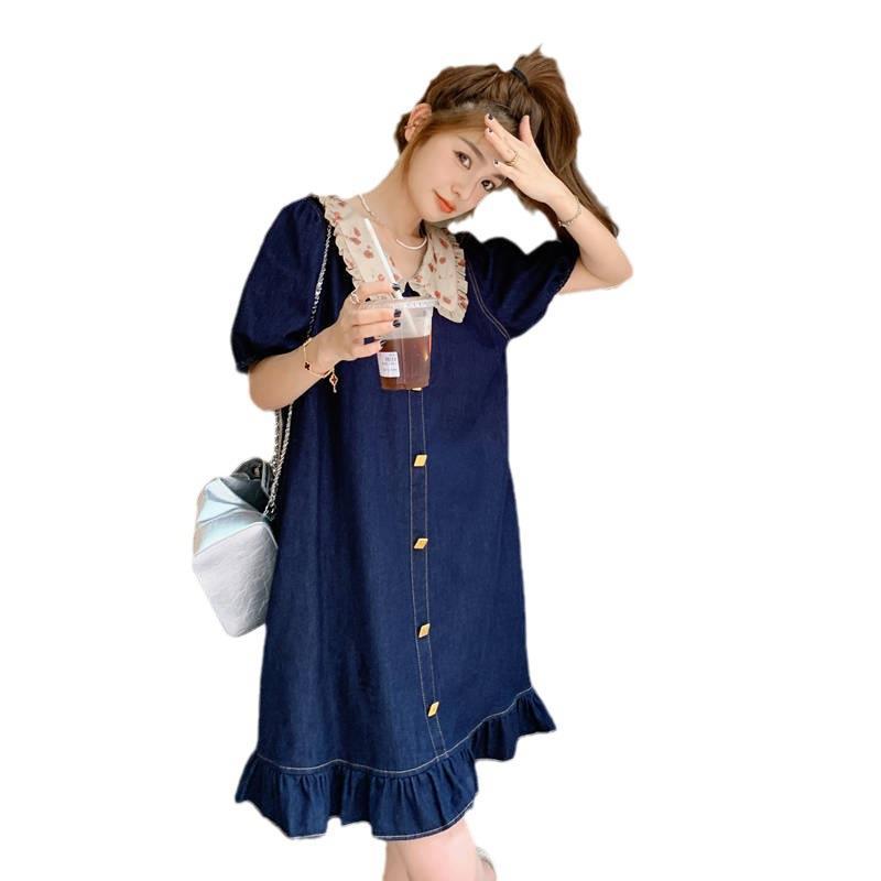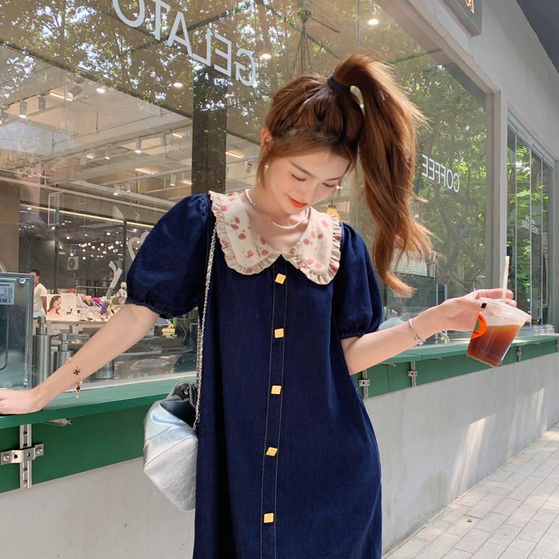 实拍拼色小碎花轻复古娃娃领金属排扣设计显瘦荷叶边裙摆牛仔裙女