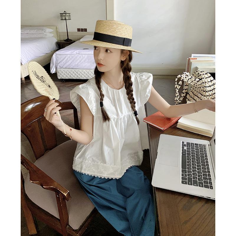 实拍俏皮少女感飞飞袖小圆领蕾丝拼接米白短上衣宽松直筒裤套装女