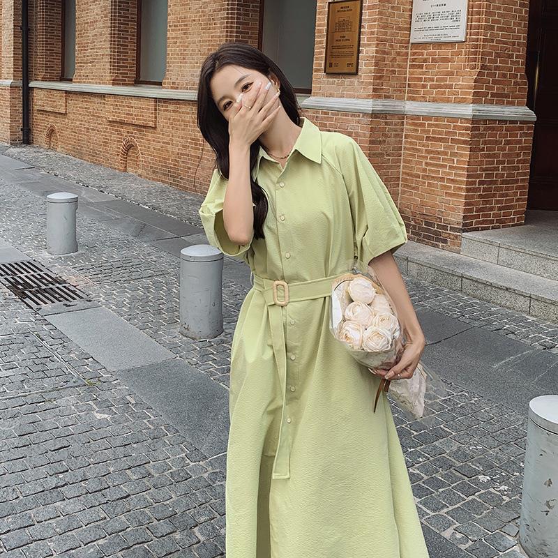 实拍polo领单排扣牛油果绿休闲风收腰显瘦下摆开衩露背连衣裙