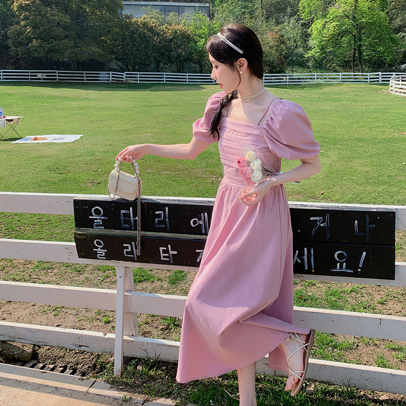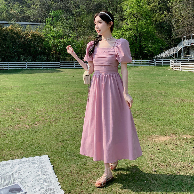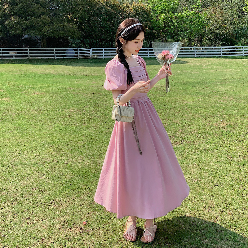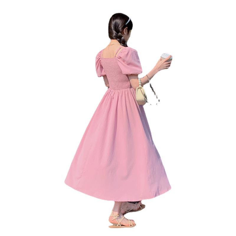 粉红色少女感方领泡泡袖连衣裙女夏新款韩版气质收腰法式长裙