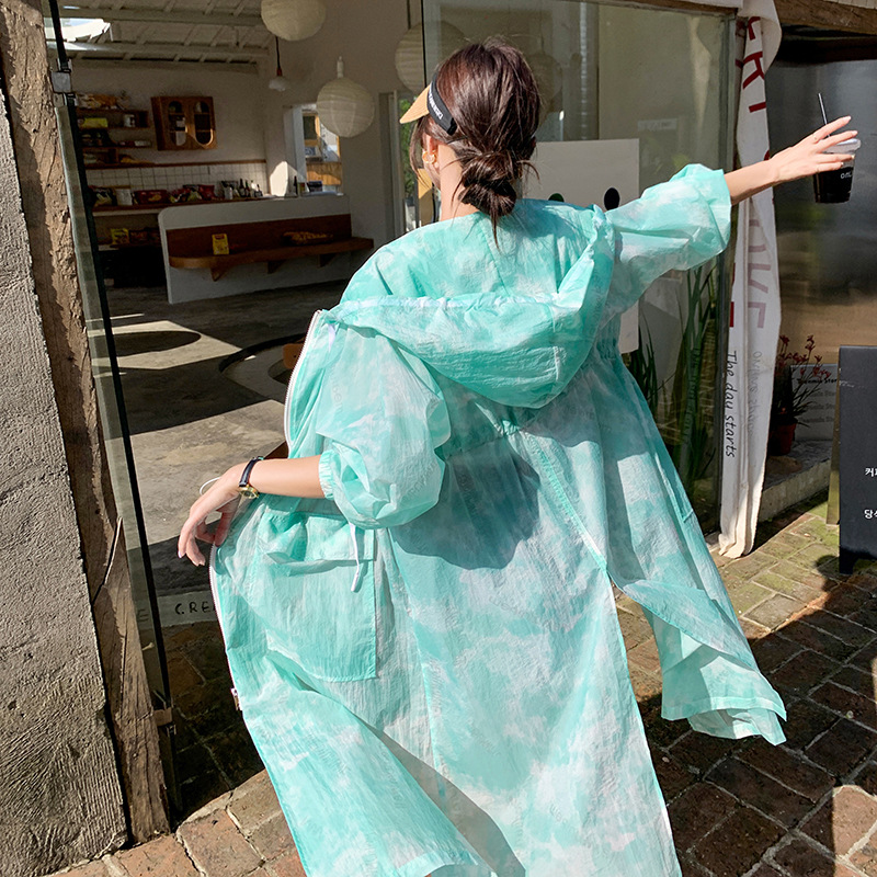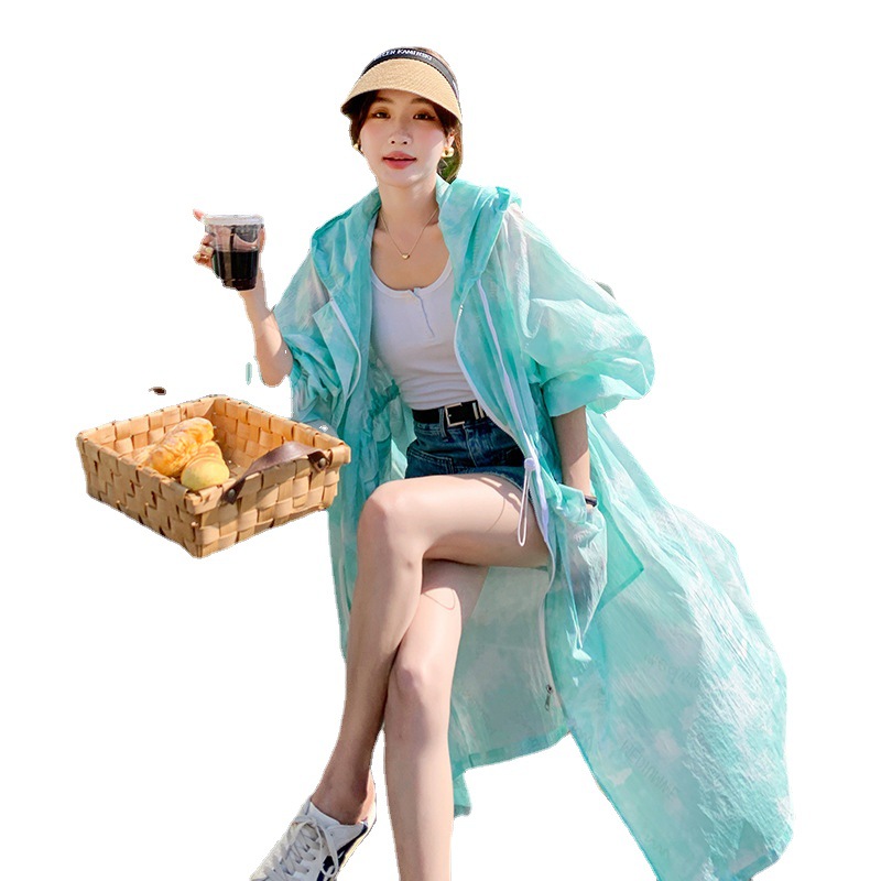 蓝色长款防晒服外套女夏季新款连帽休闲防晒衣薄款防晒风衣