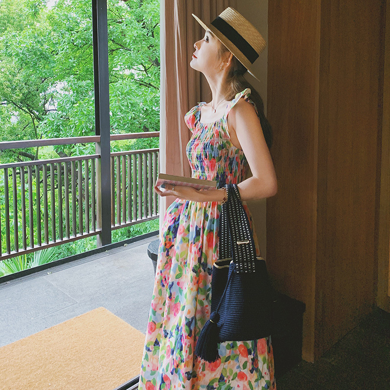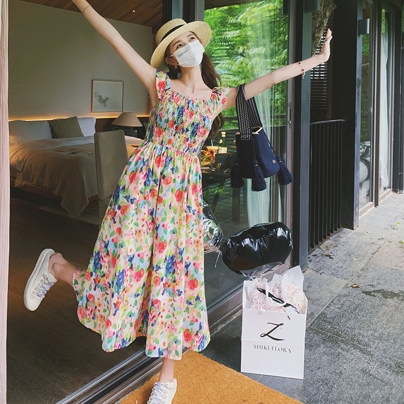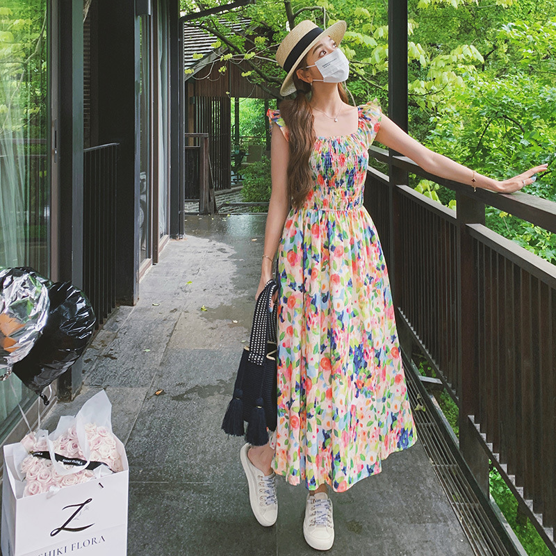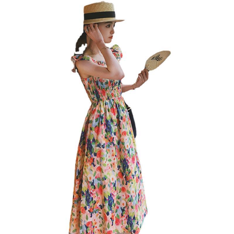 夏季新款法式初恋连衣裙气质感松紧腰长裙温柔淑女风收腰裙子