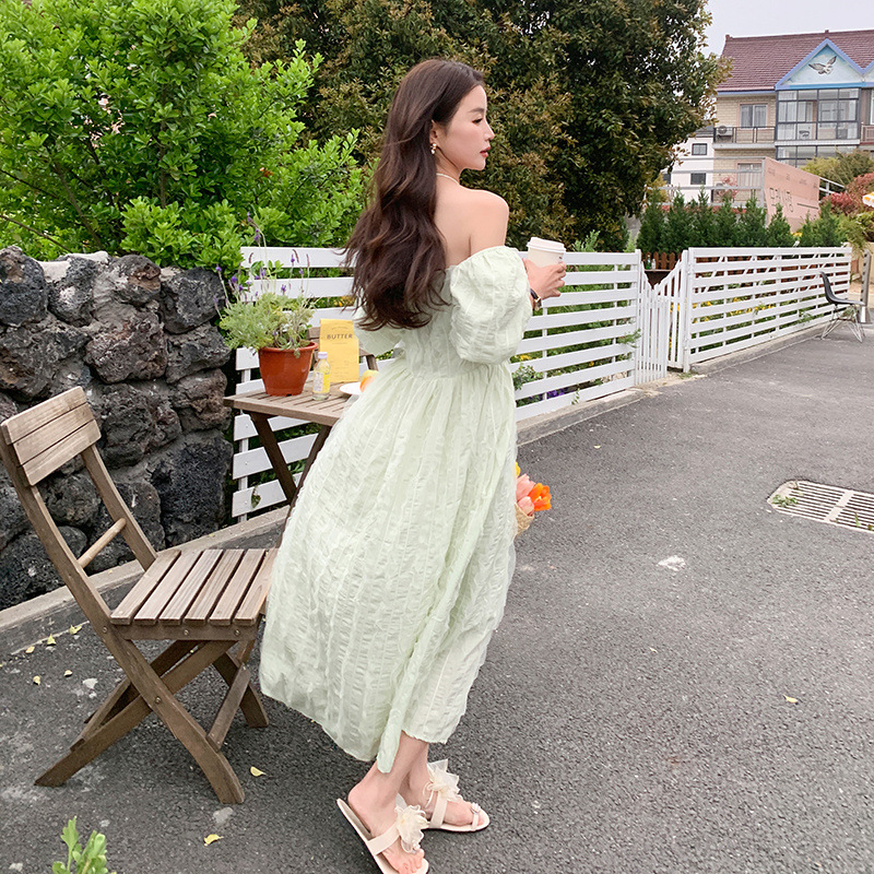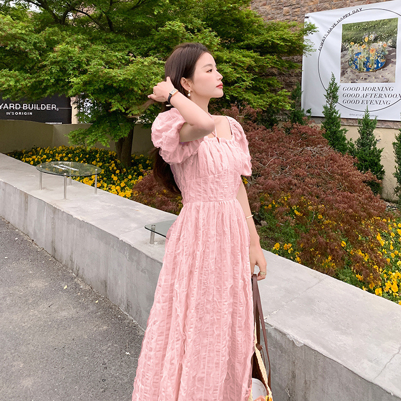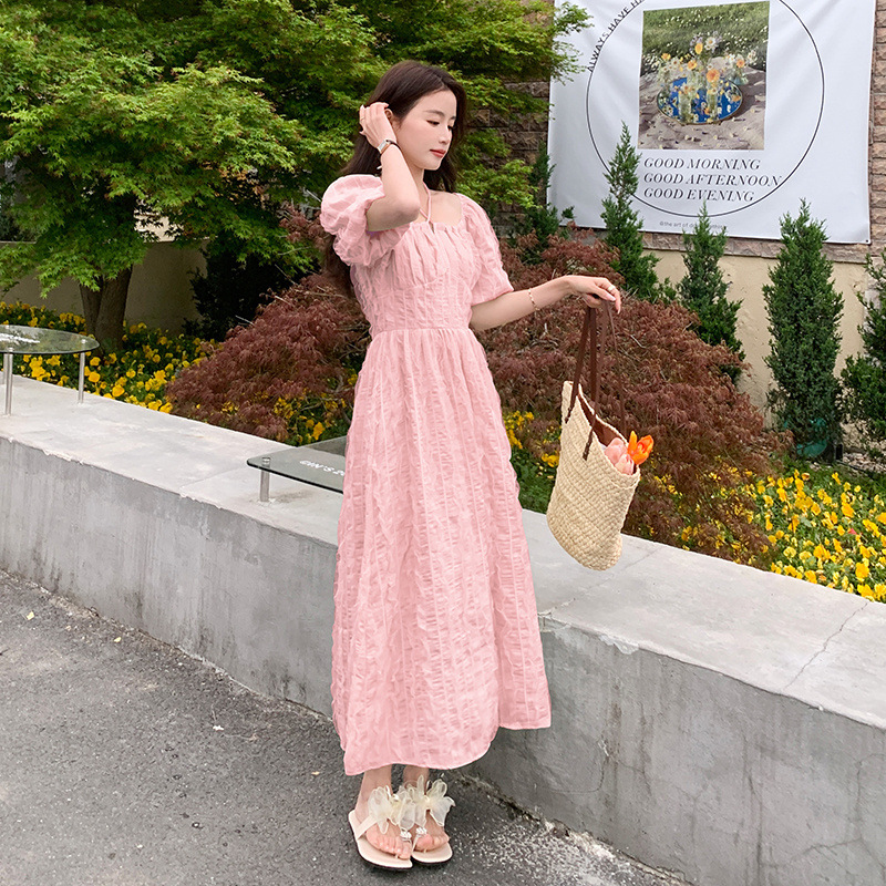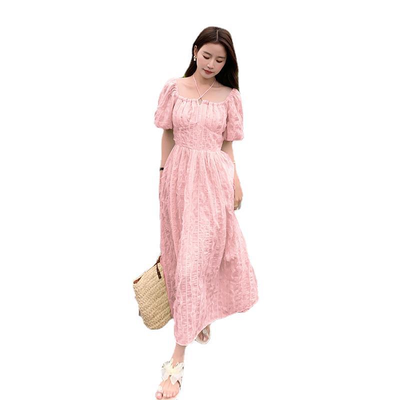 粉色连衣裙女夏季新款显瘦气质温柔小众别致雪纺一字肩仙女裙