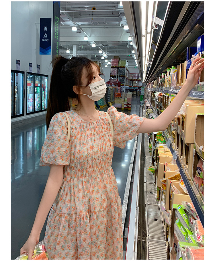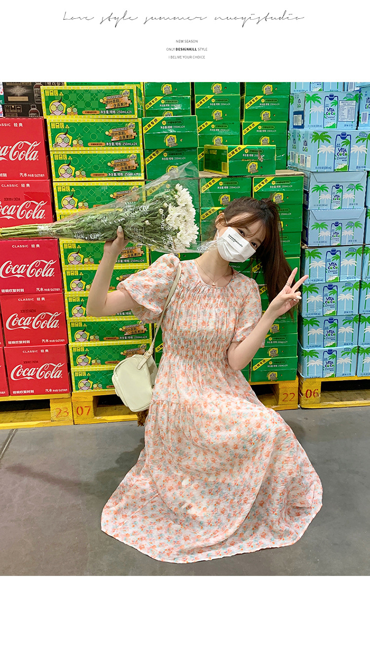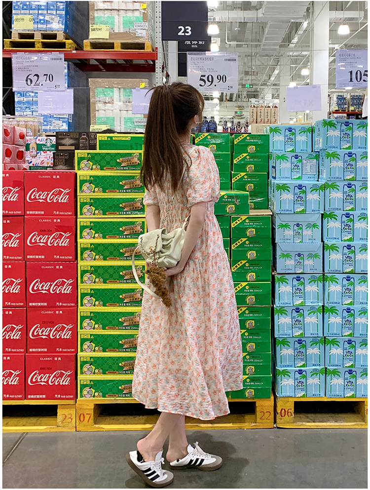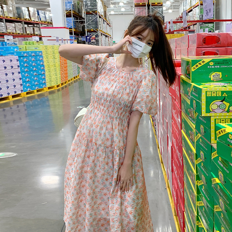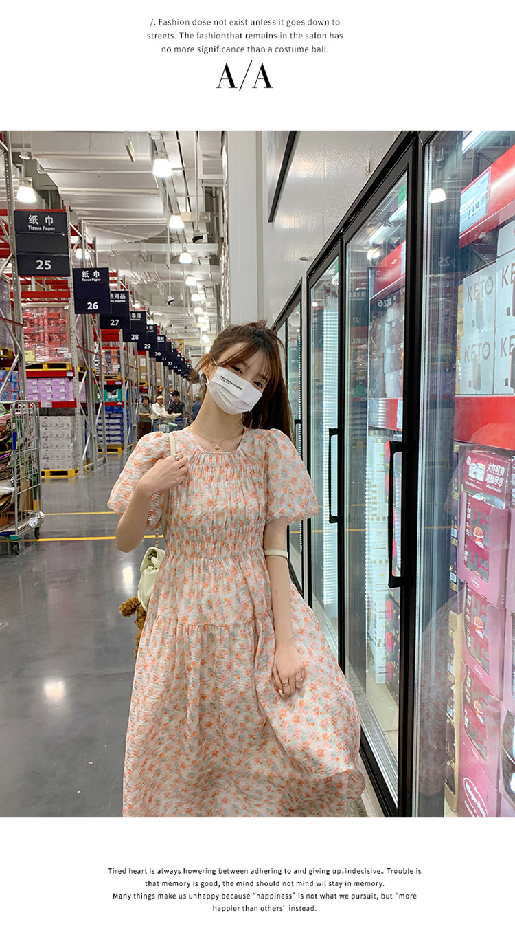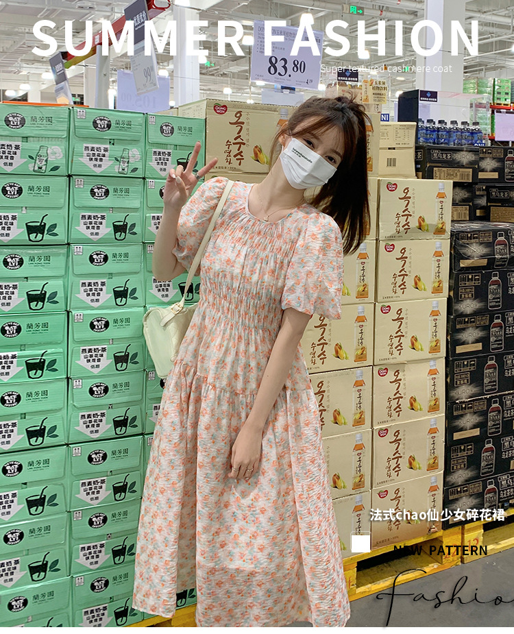 欧货碎花褶皱高腰连衣裙夏季新款设计感法式复古桔梗茶歇长裙