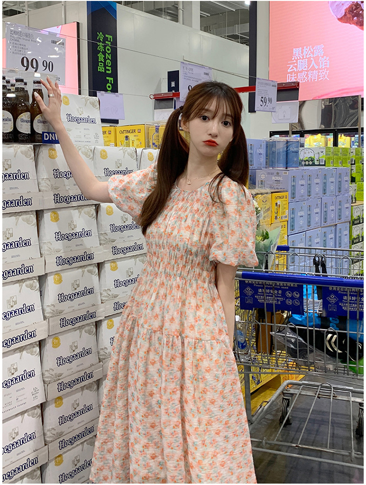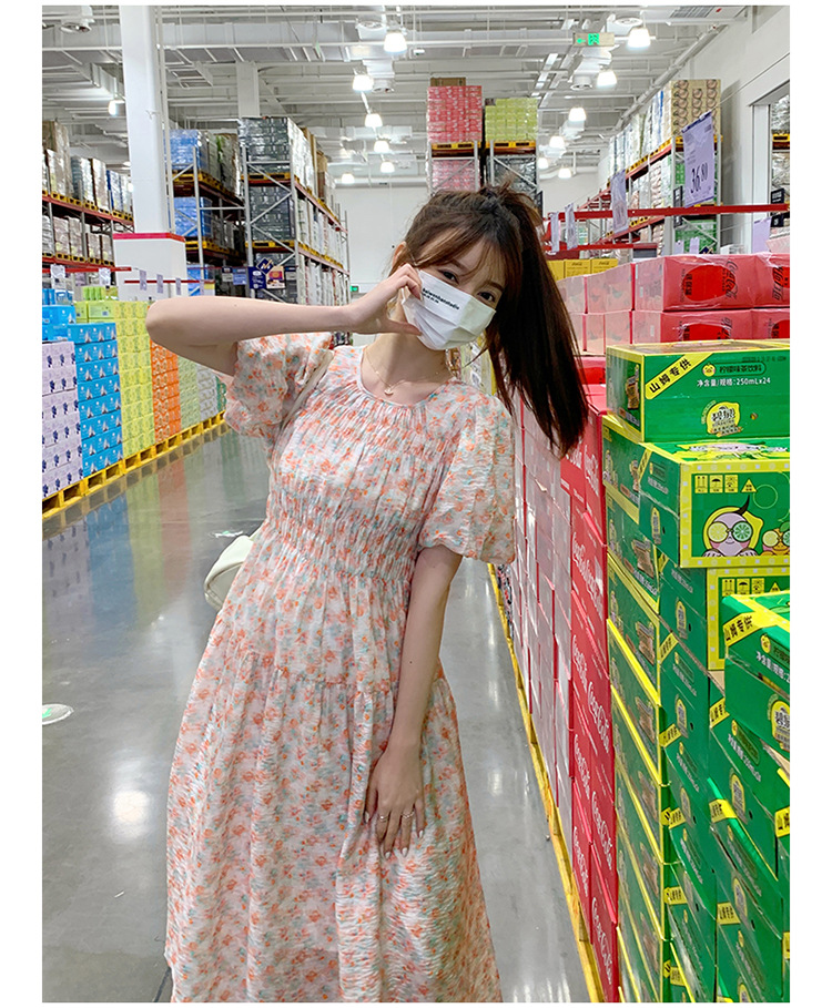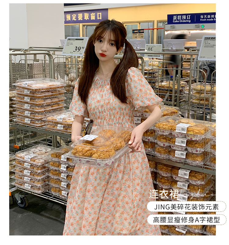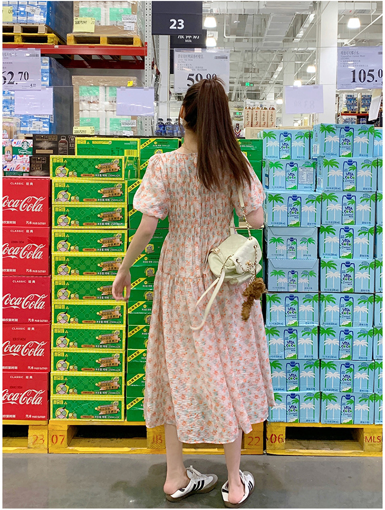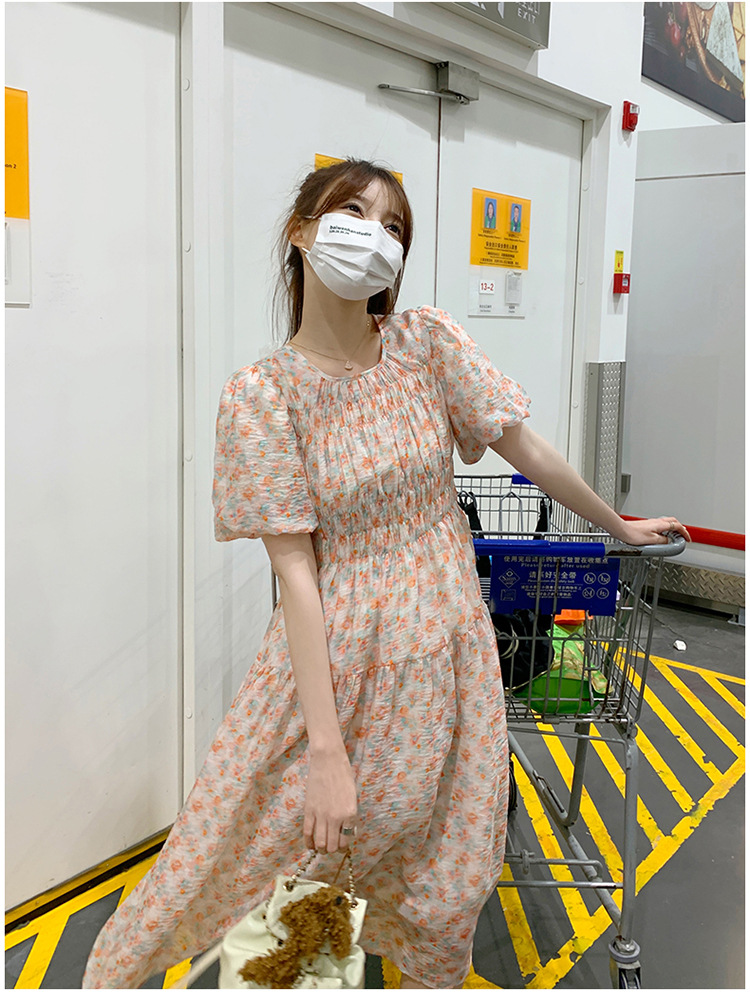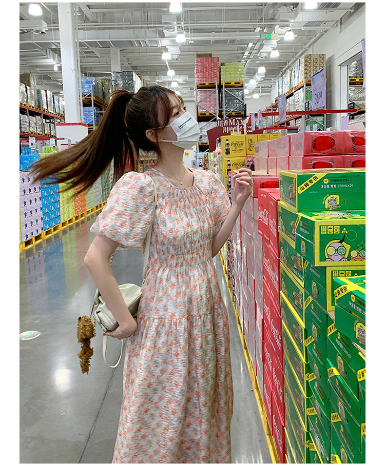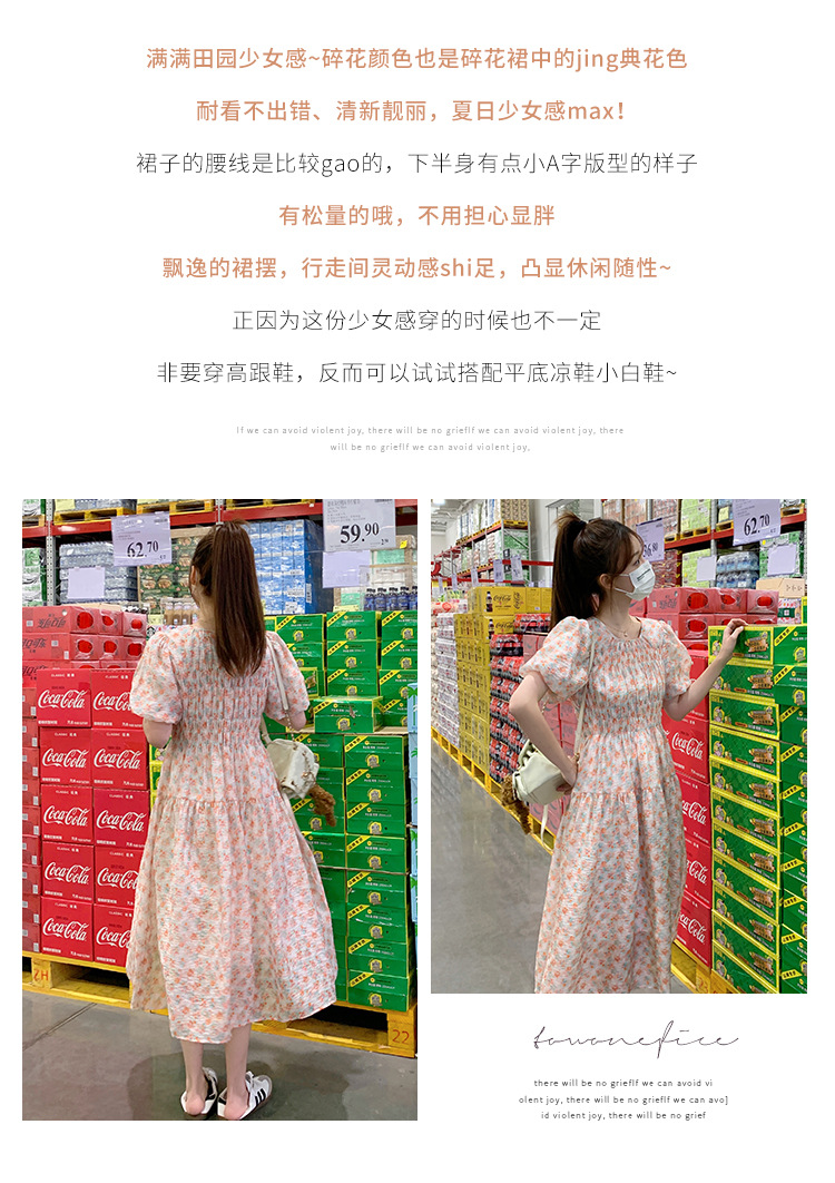 欧货碎花褶皱高腰连衣裙夏季新款设计感法式复古桔梗茶歇长裙