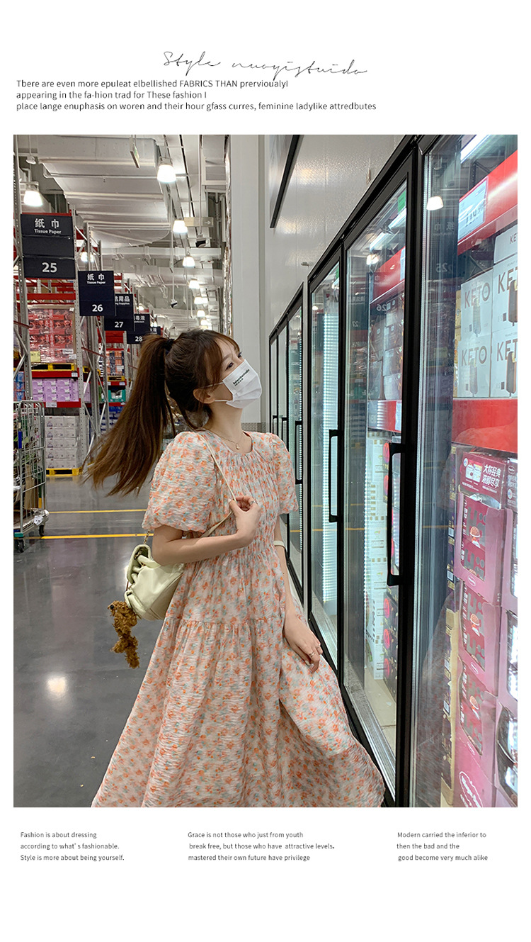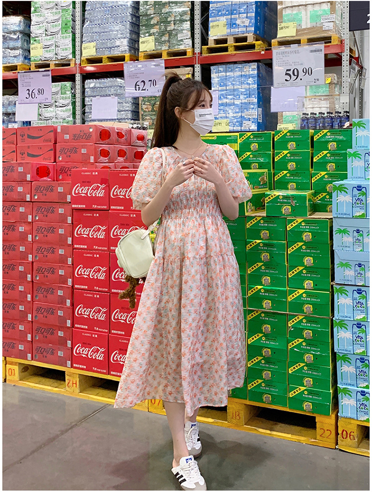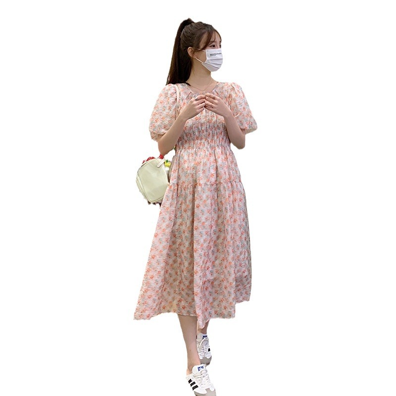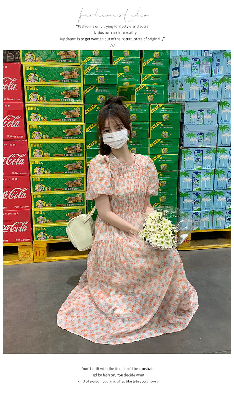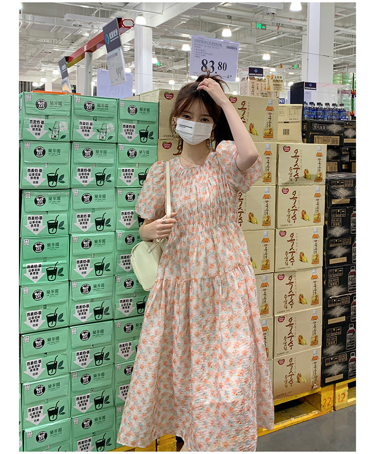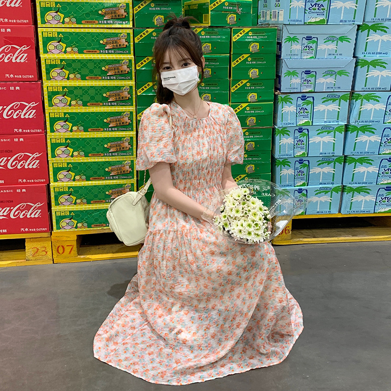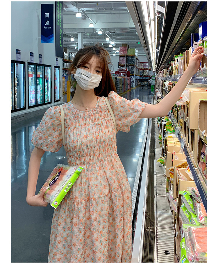 欧货碎花褶皱高腰连衣裙夏季新款设计感法式复古桔梗茶歇长裙