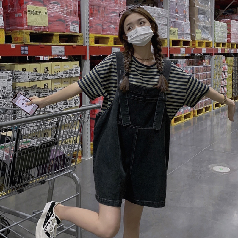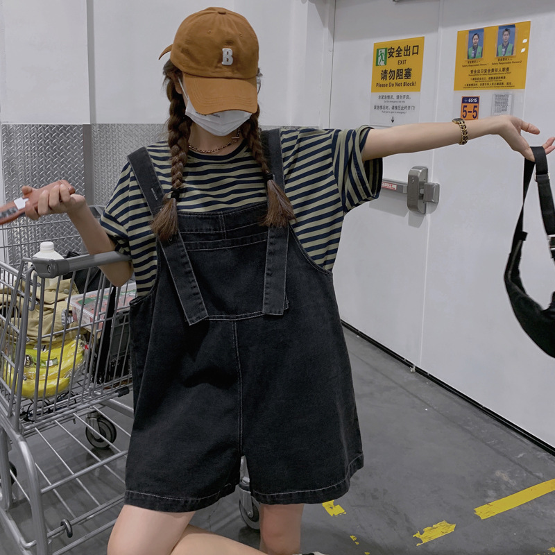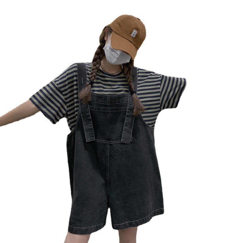 实拍牛仔背带裤女夏季薄款炸街港味复古宽松显瘦阔腿短裤套装