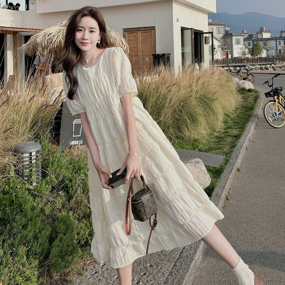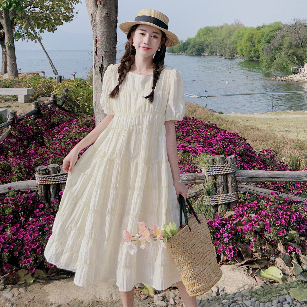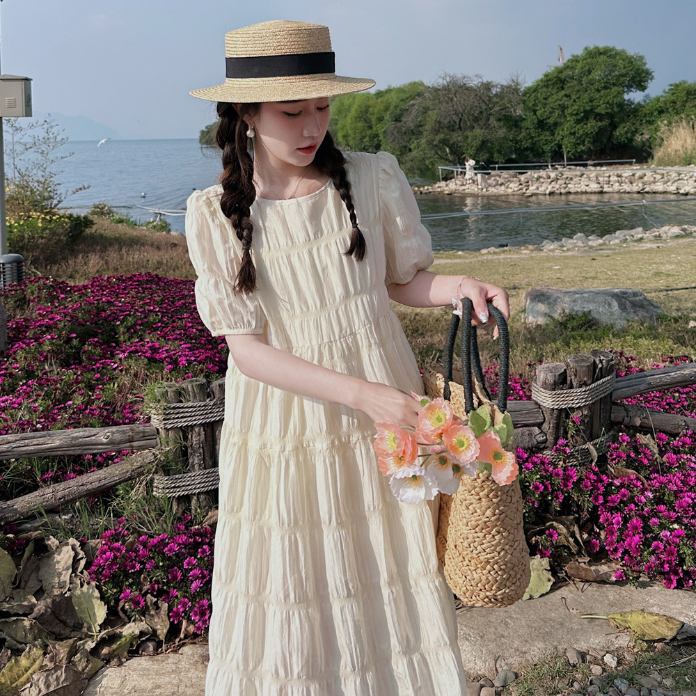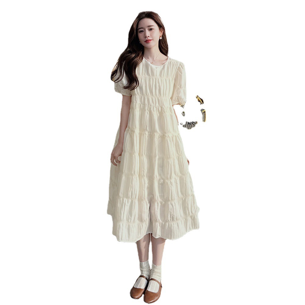 实拍米白色褶皱肌理感圆领套头泡泡袖小个子温柔风高腰显瘦连衣裙
