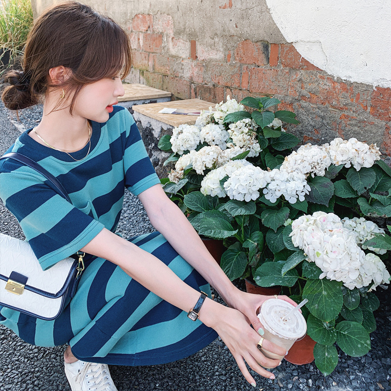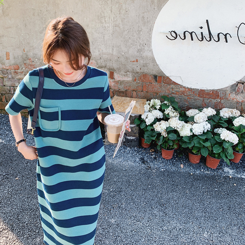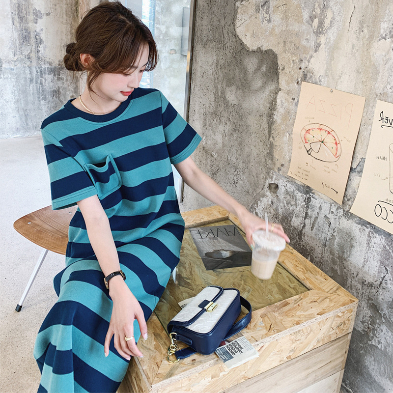 实拍新款拼色休闲条纹T恤裙女夏季设计感小众宽松直筒减龄连衣裙