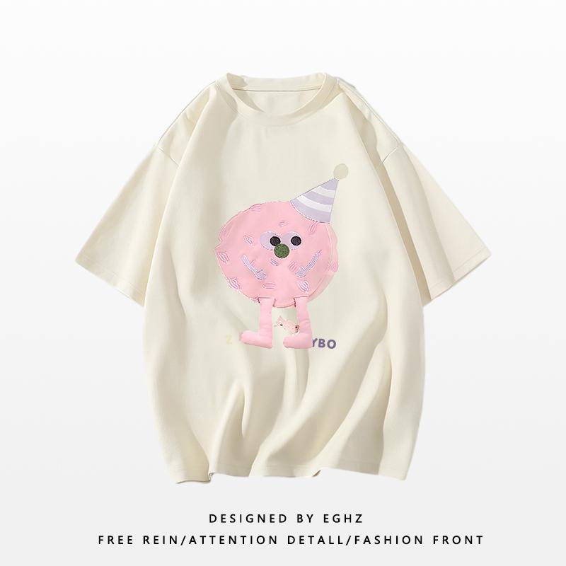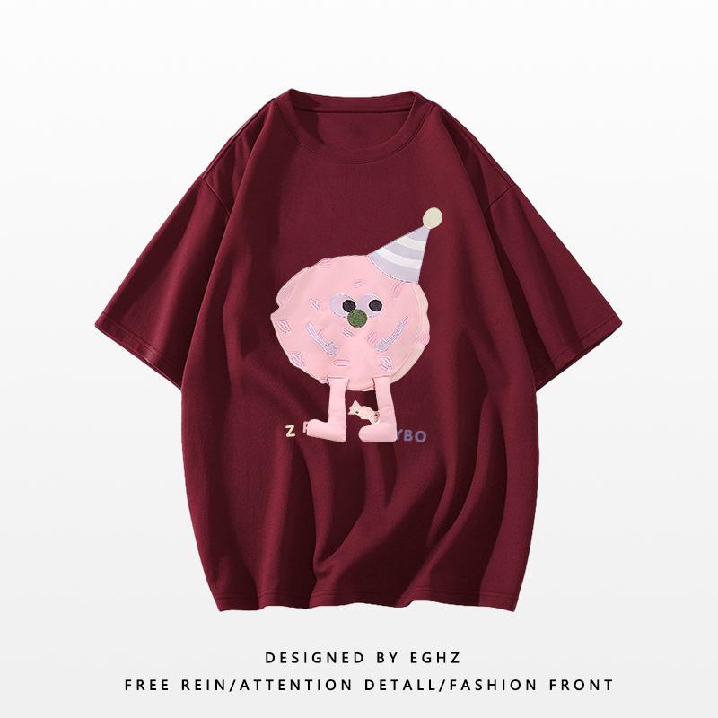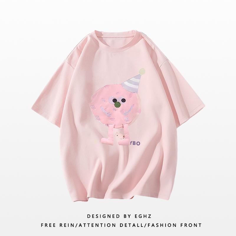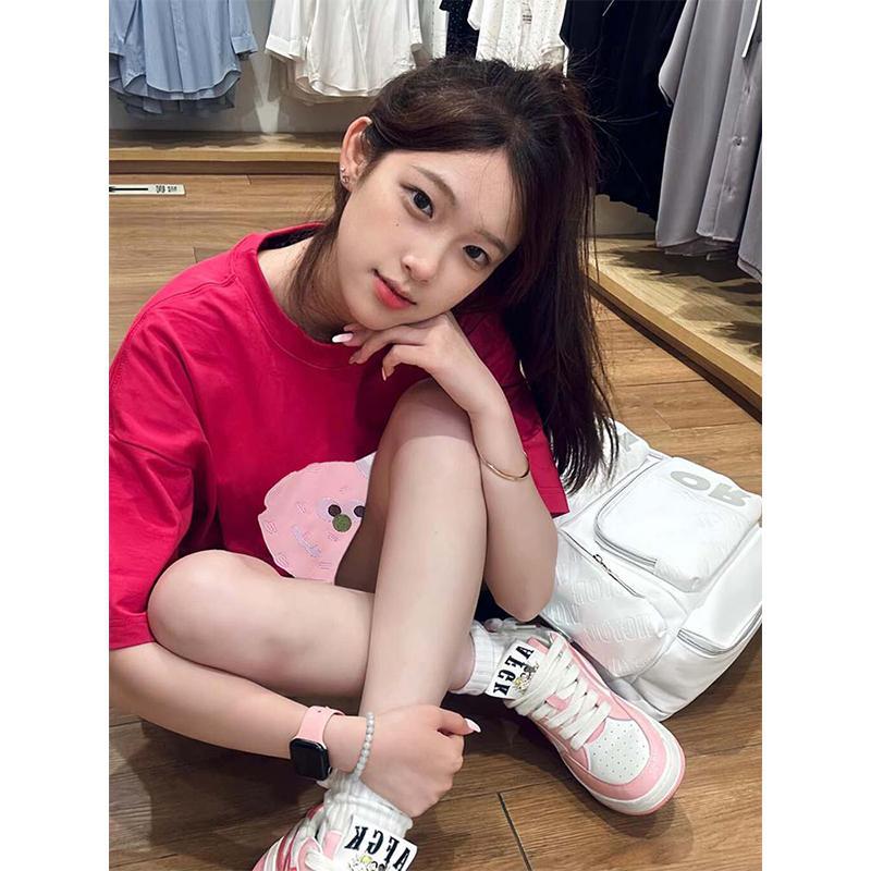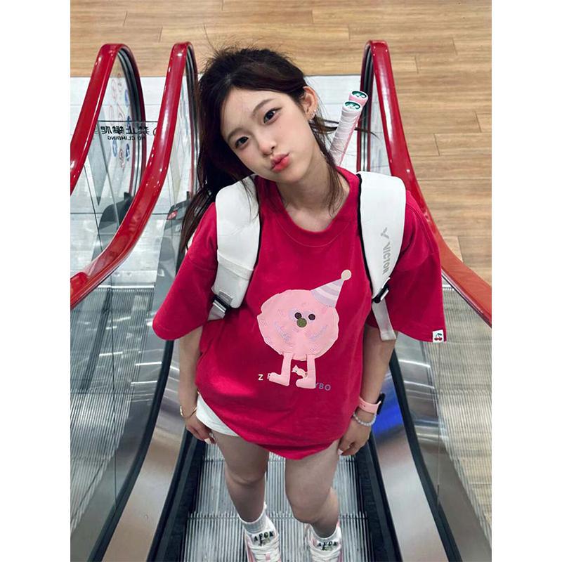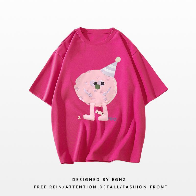 火龙果色重磅短袖t恤女夏季宽松可爱甜美多巴胺穿搭印花半袖上衣