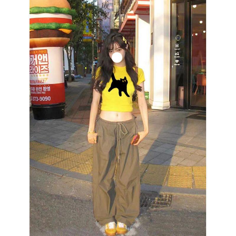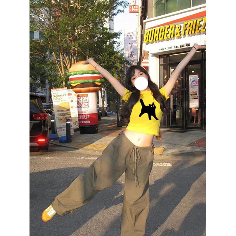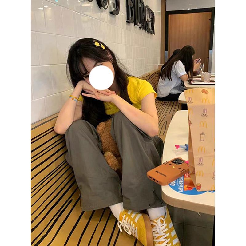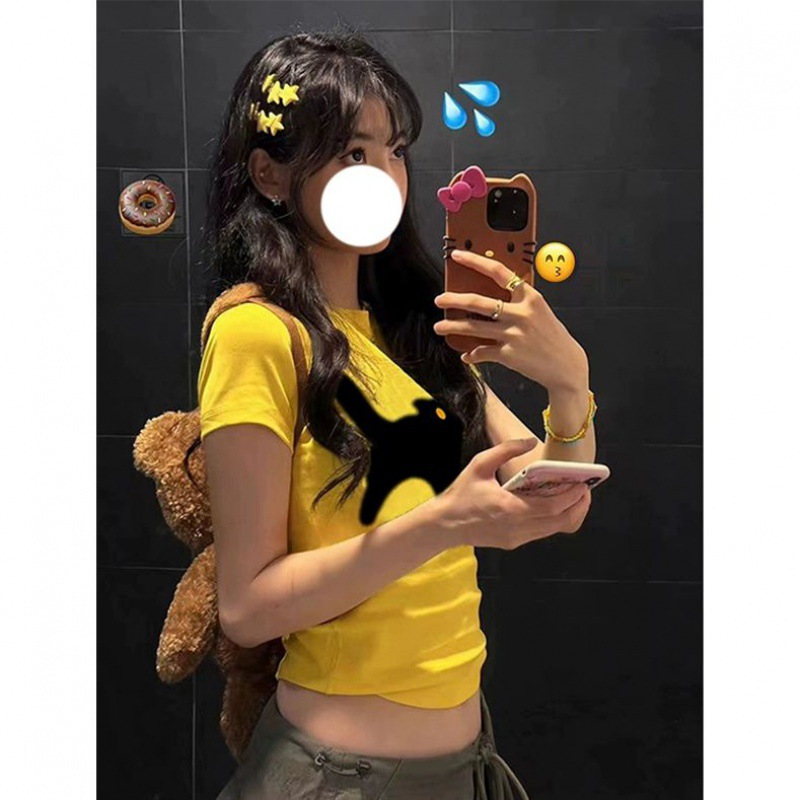 多巴胺黄色正肩短袖t恤女夏季氛围感紧身甜辣小个子短款百搭上衣