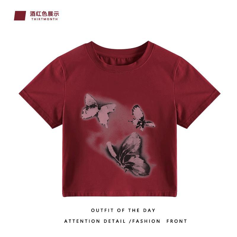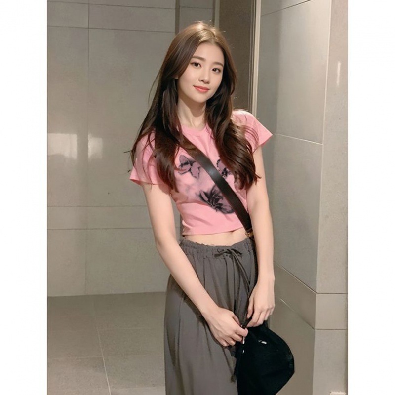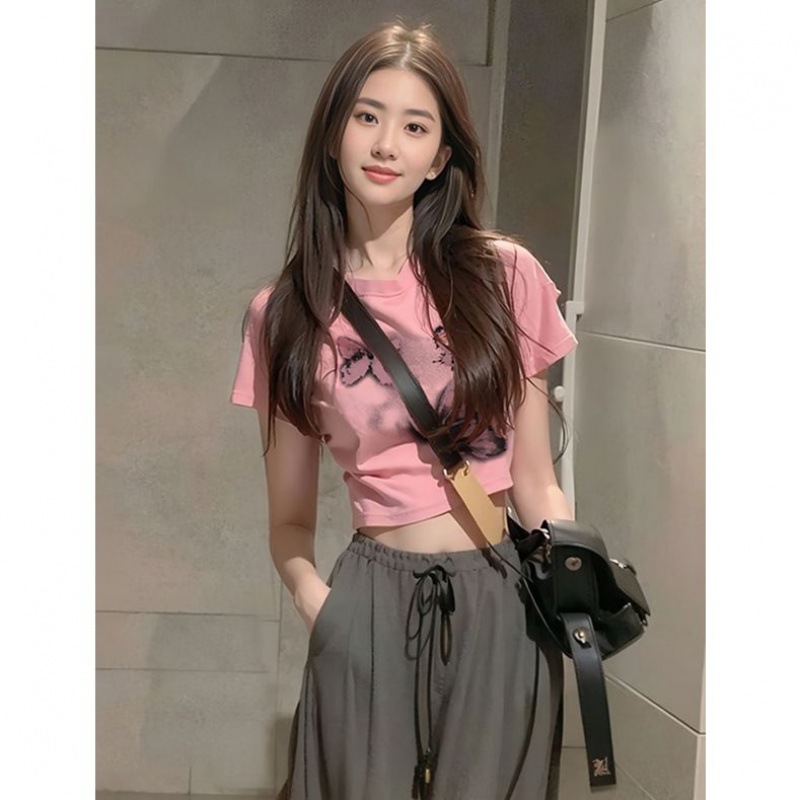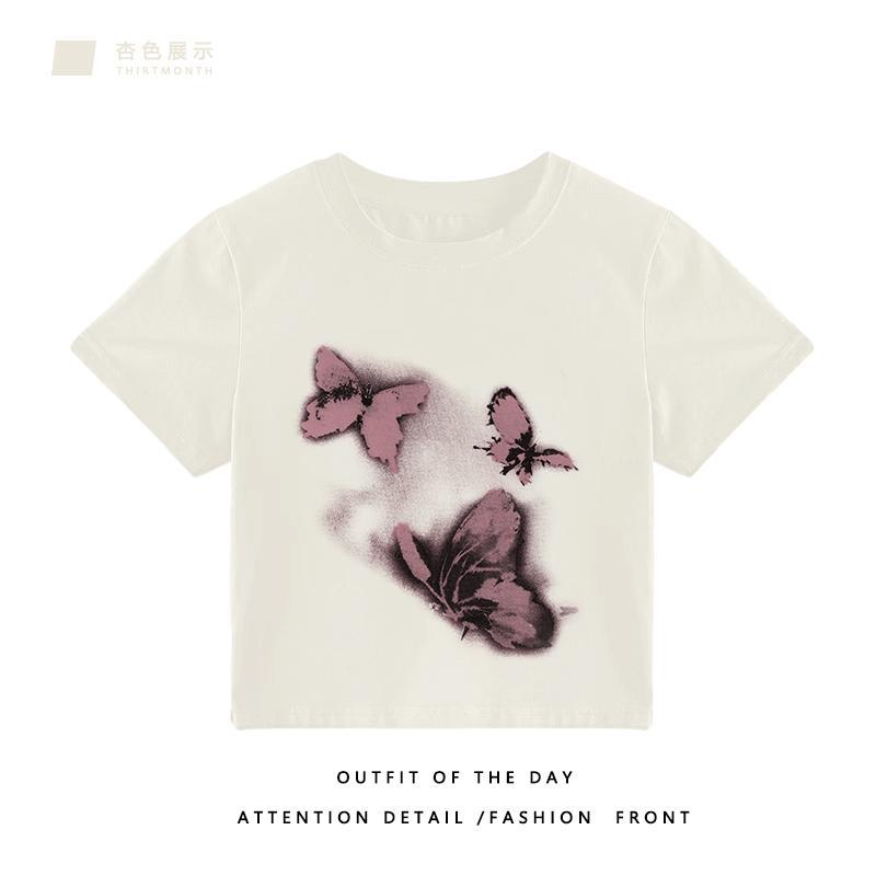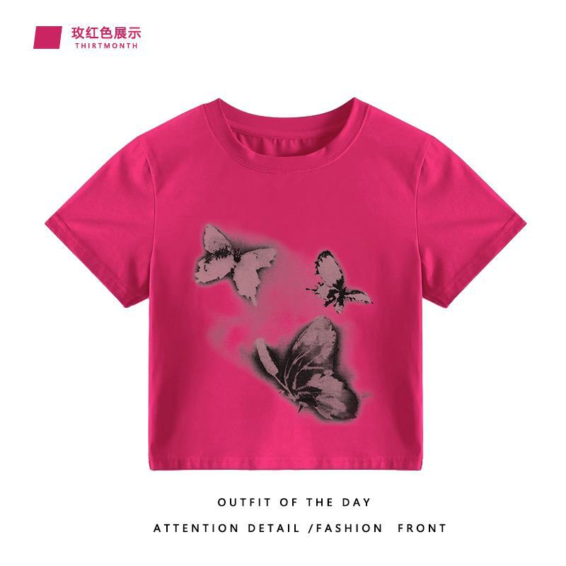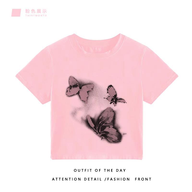 国潮小众短袖设计感纯棉T恤女火龙果色宽松大码半袖夏季上衣服潮