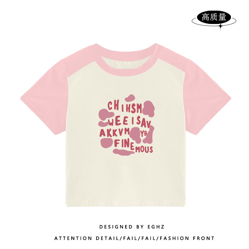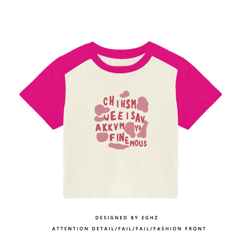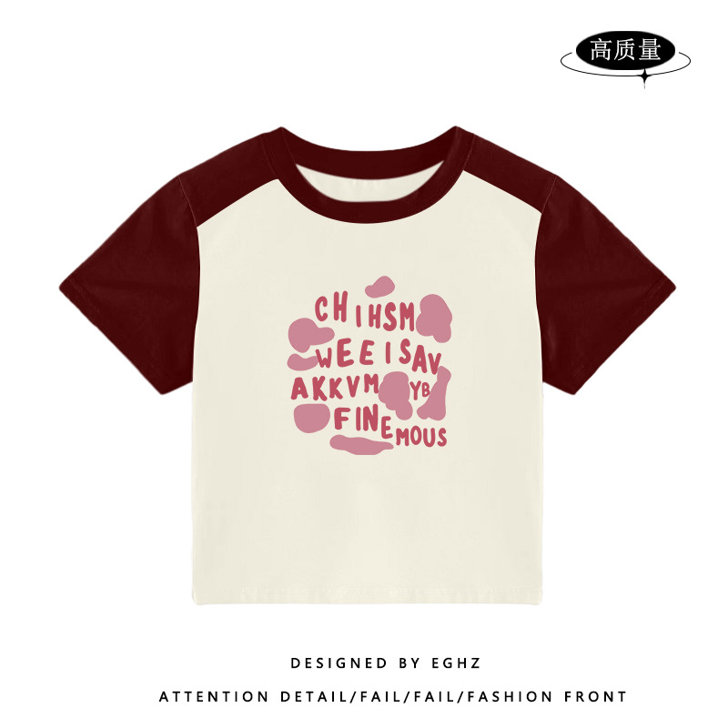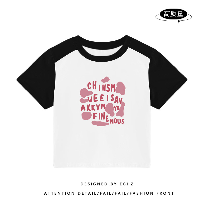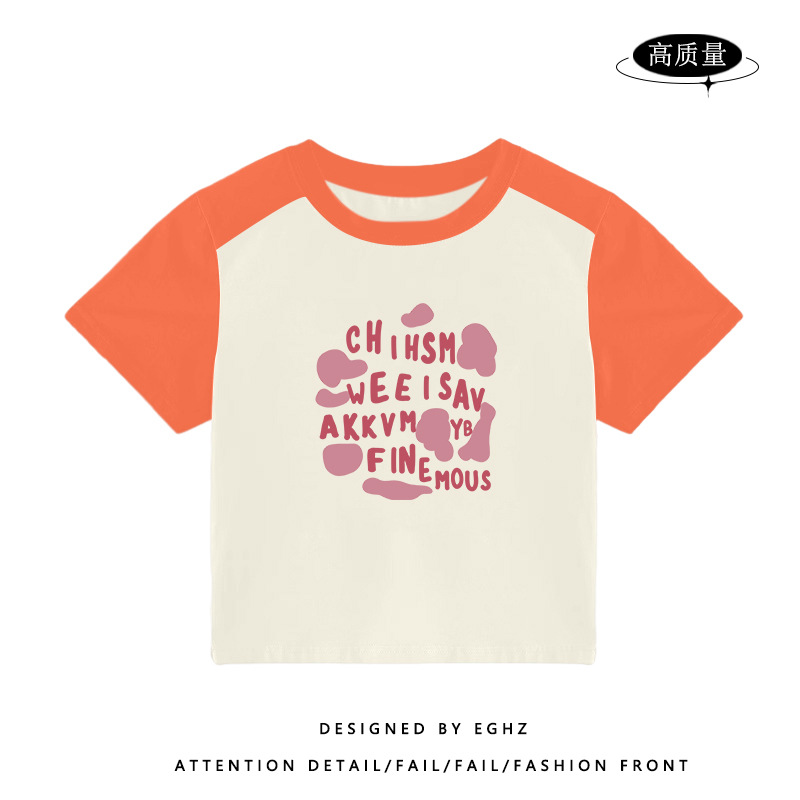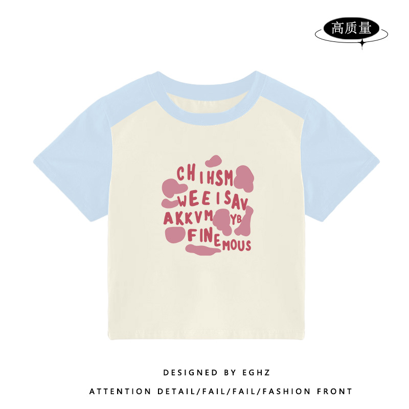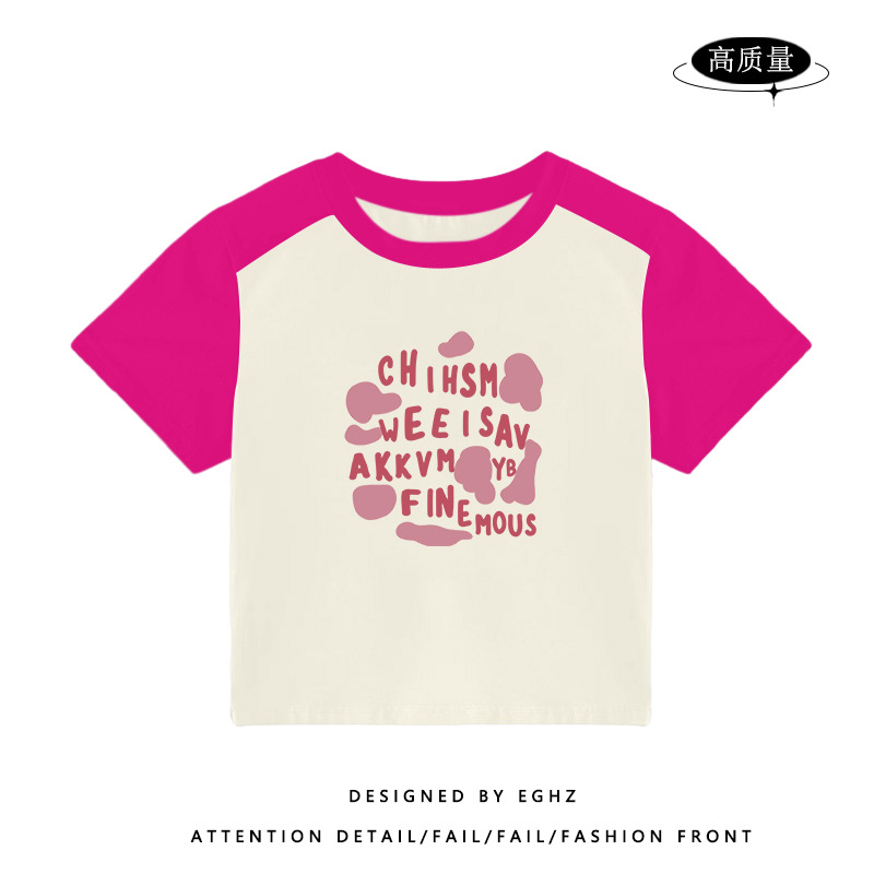 插肩撞色短款百搭短袖t恤女年甜辣独特小众字母印花小衫上衣