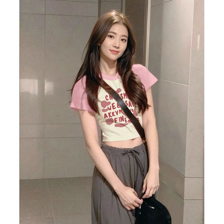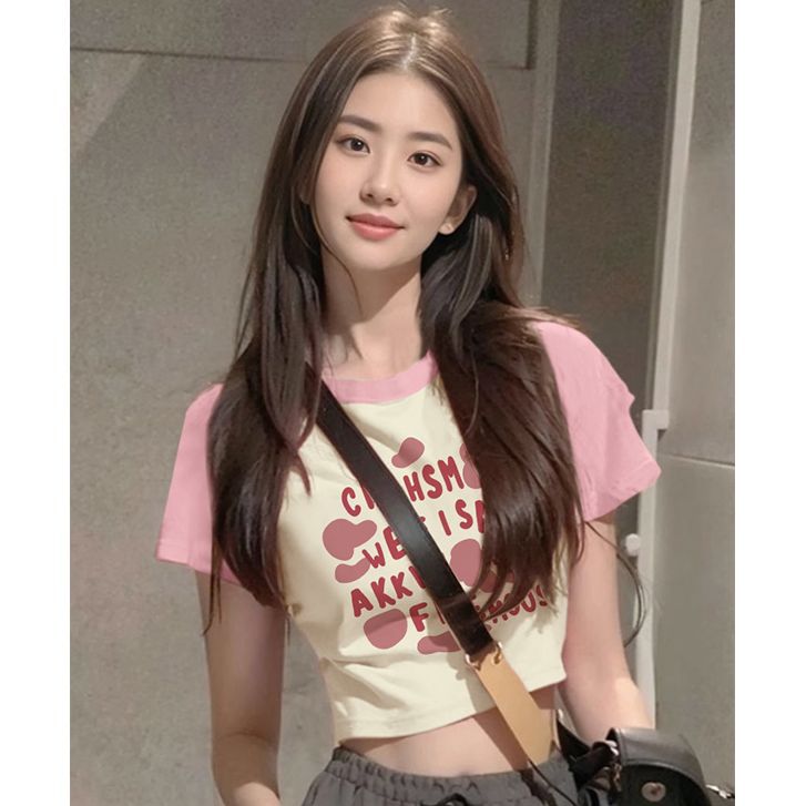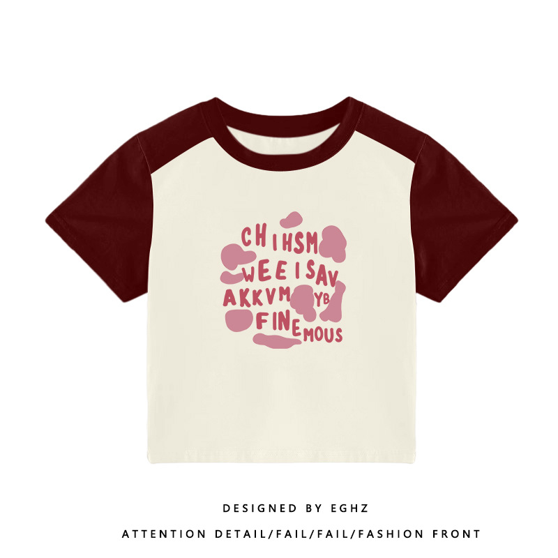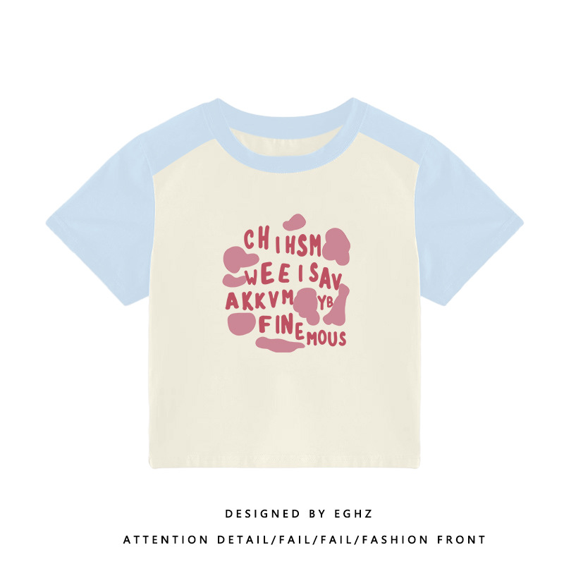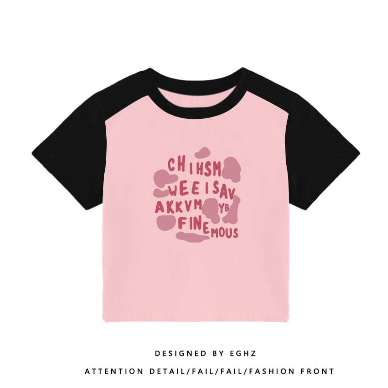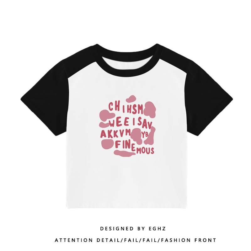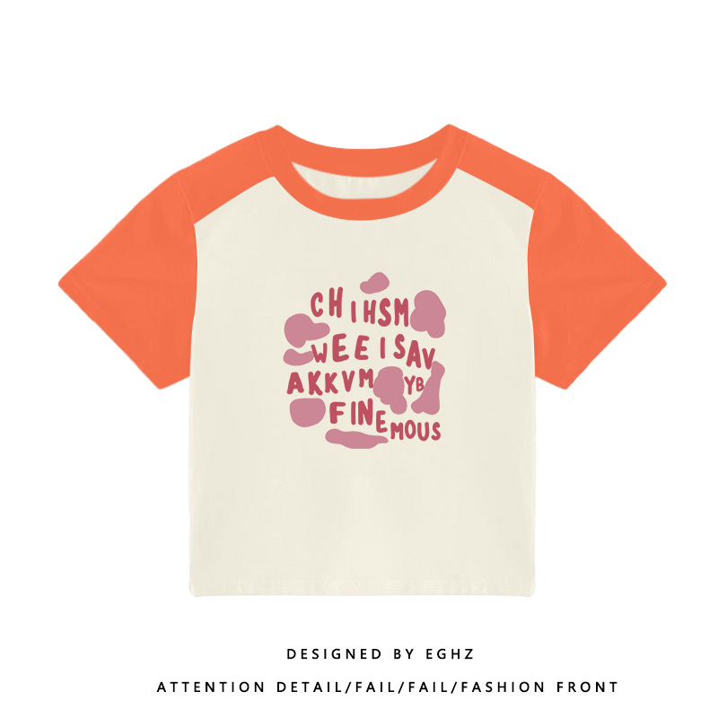 插肩撞色短款百搭短袖t恤女年甜辣独特小众字母印花小衫上衣