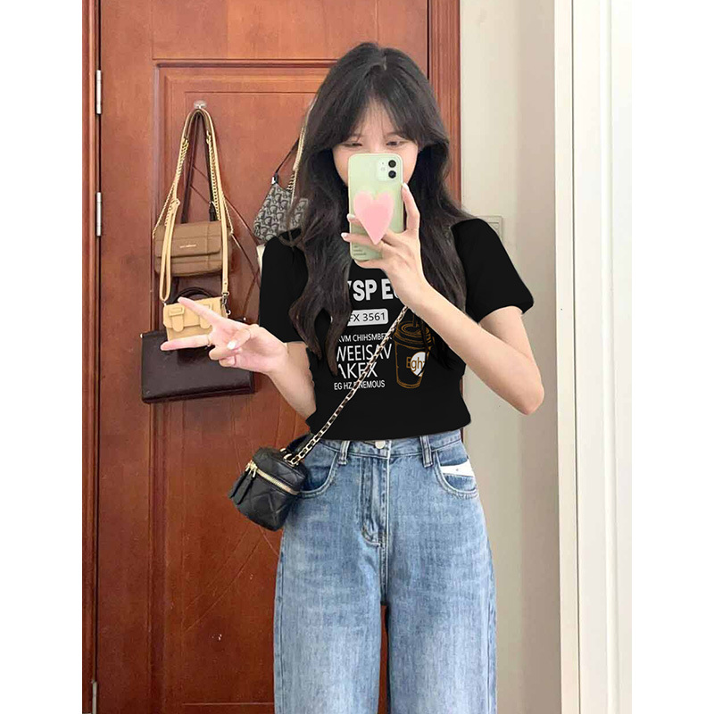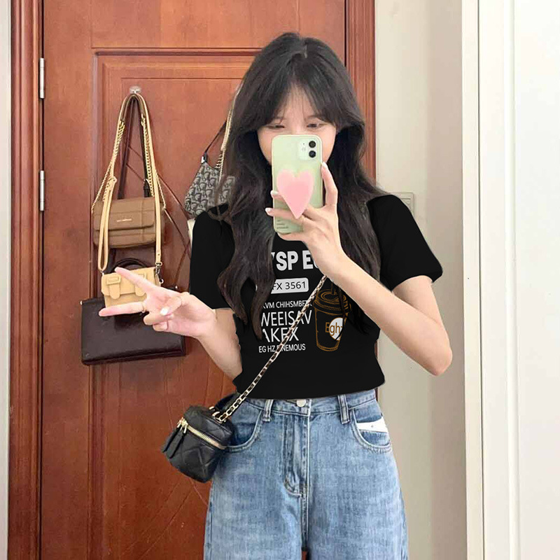 黑色棉短款短袖t恤上衣女早春小个子高腰露脐辣妹卡腰小衫体恤