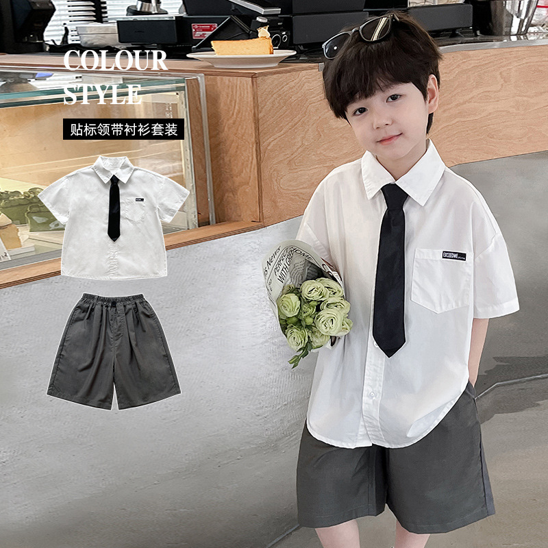 童酷儿童夏季新款韩版男童衬衫短裤洋气领带翻领贴标男童套装