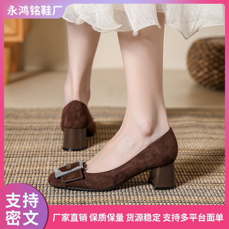 秋季浅口单鞋方扣水钻女鞋韩版新款法式方头绒面粗跟高跟鞋女鞋子