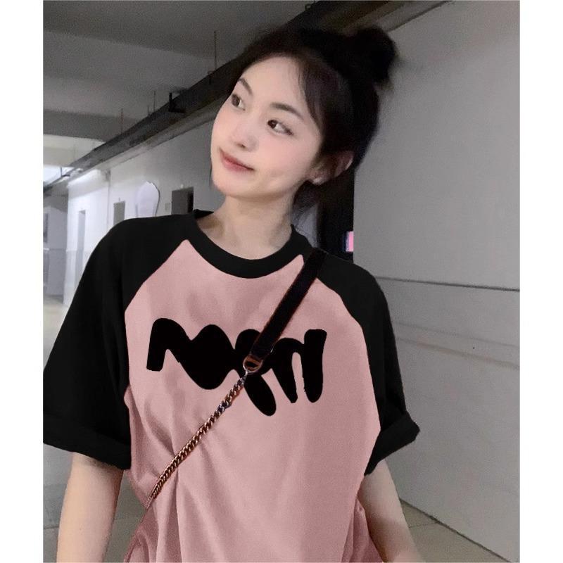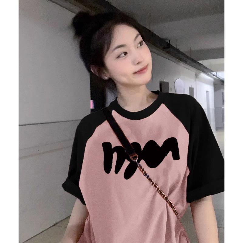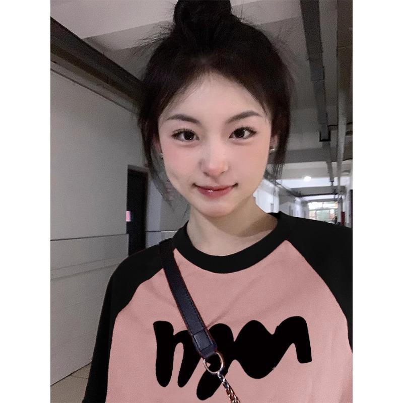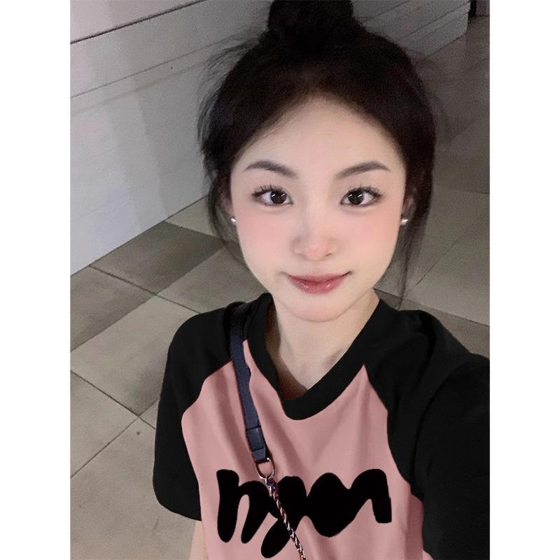 多巴胺穿搭拼色插肩袖宽松短袖女夏季新款慵懒风圆领正肩上衣
