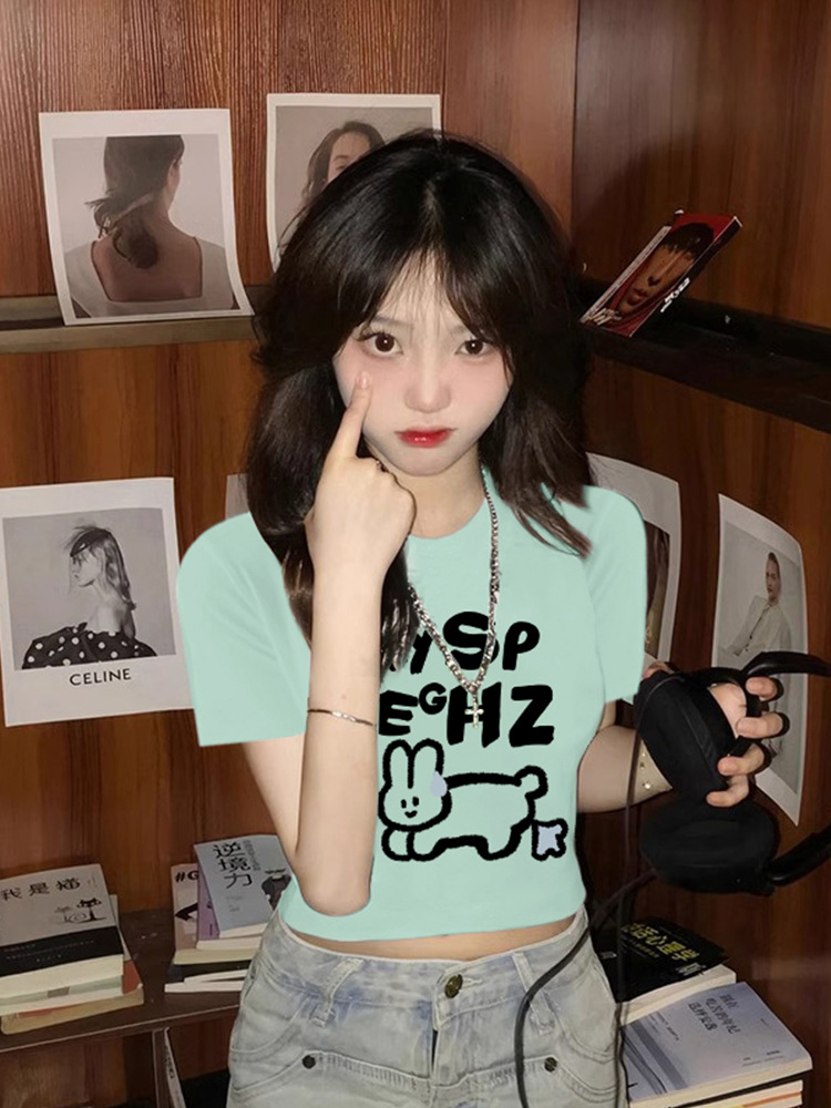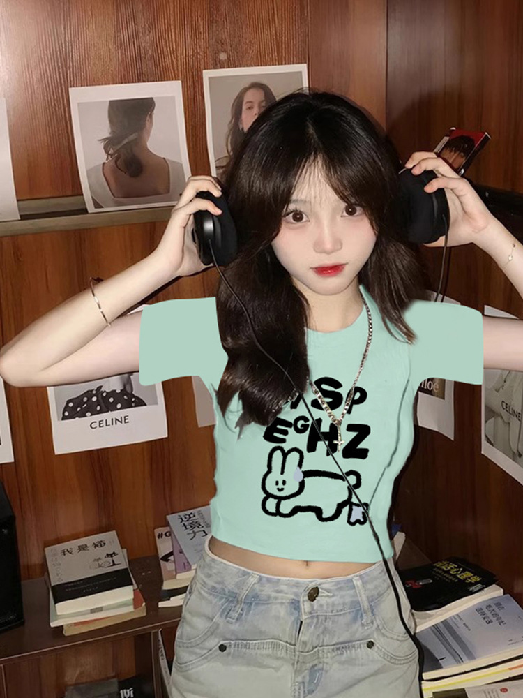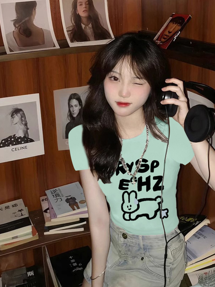 薄荷绿色正肩短袖t恤女夏季修身收腰显瘦设计感小众辣妹短款上衣
