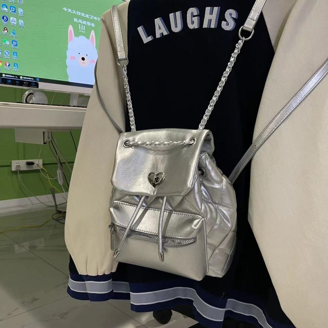 潮酷银色双肩包包女夏新款潮小香风菱格背包百搭单肩旅行包