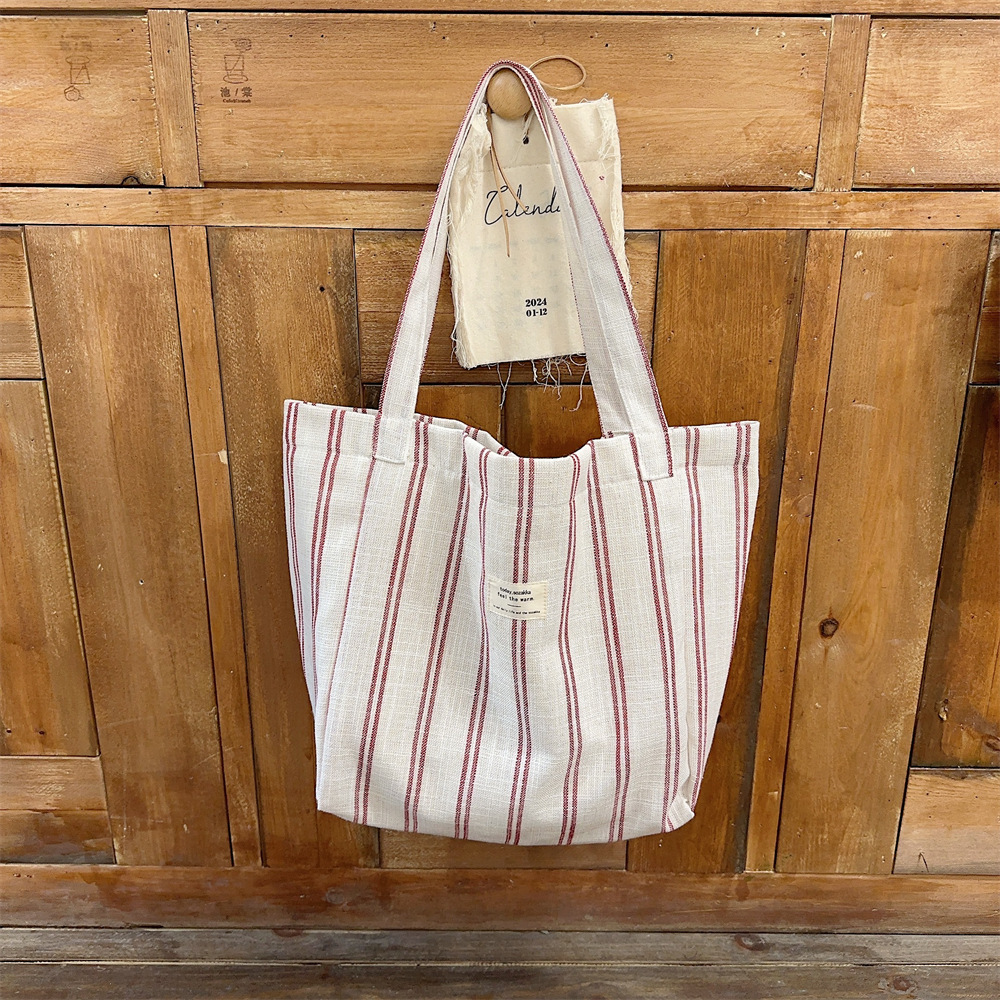 韩版大容量时尚撞色条纹托特包春夏条纹休闲包包单肩帆布包