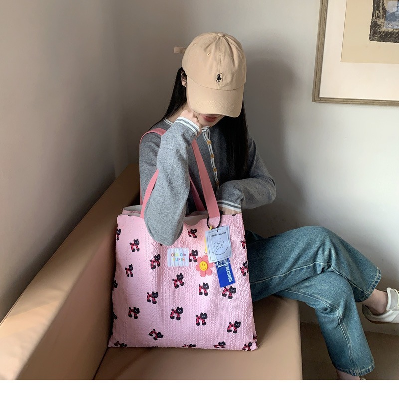 春秋新款大容量小潮猫学院风手提托特包条纹发泡慵懒风帆布包