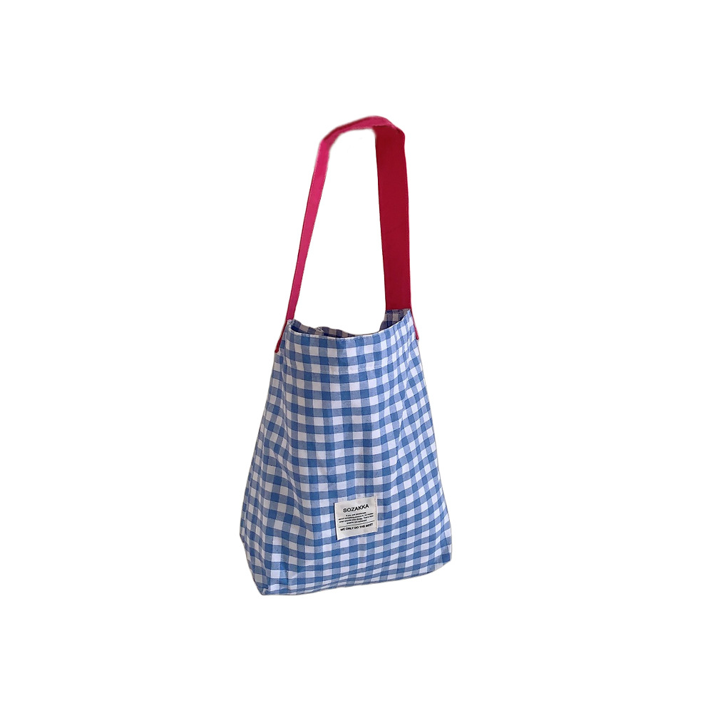帆布包包女新款撞色格子单肩布袋大学生文艺通勤托特包