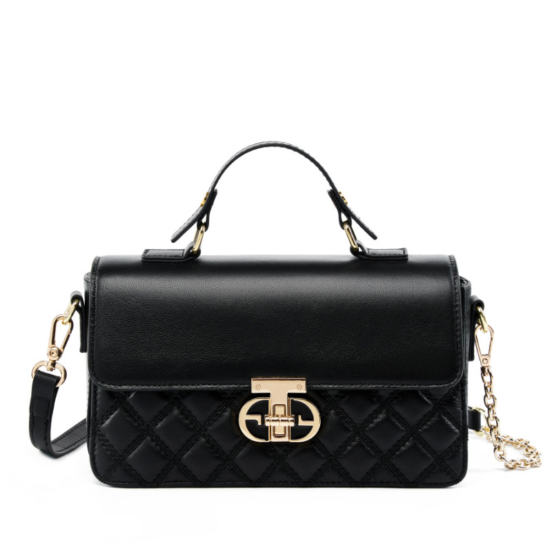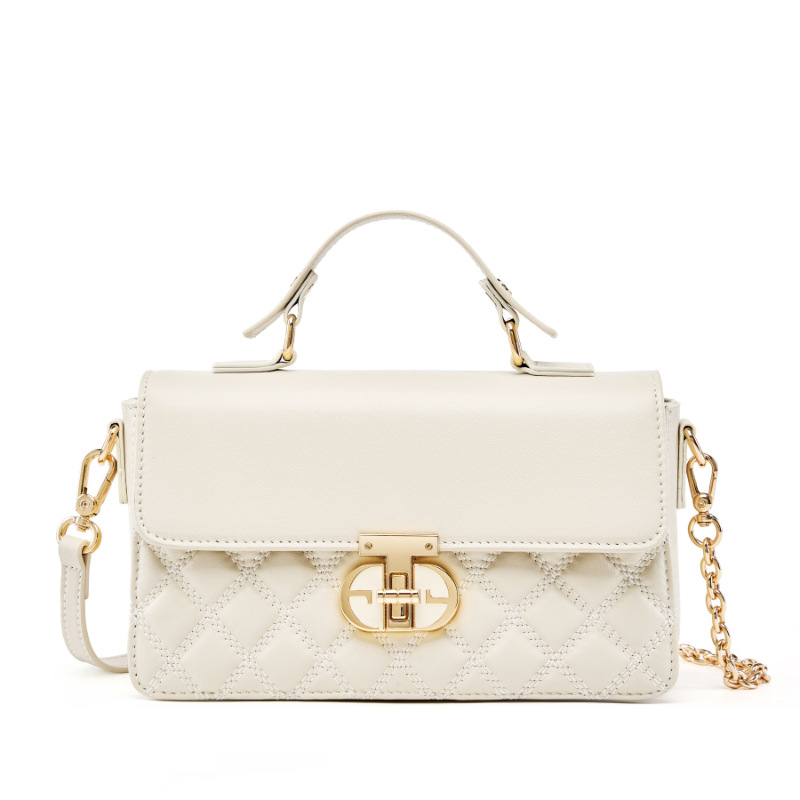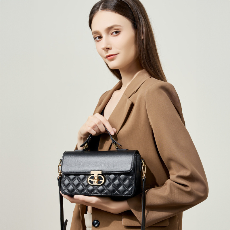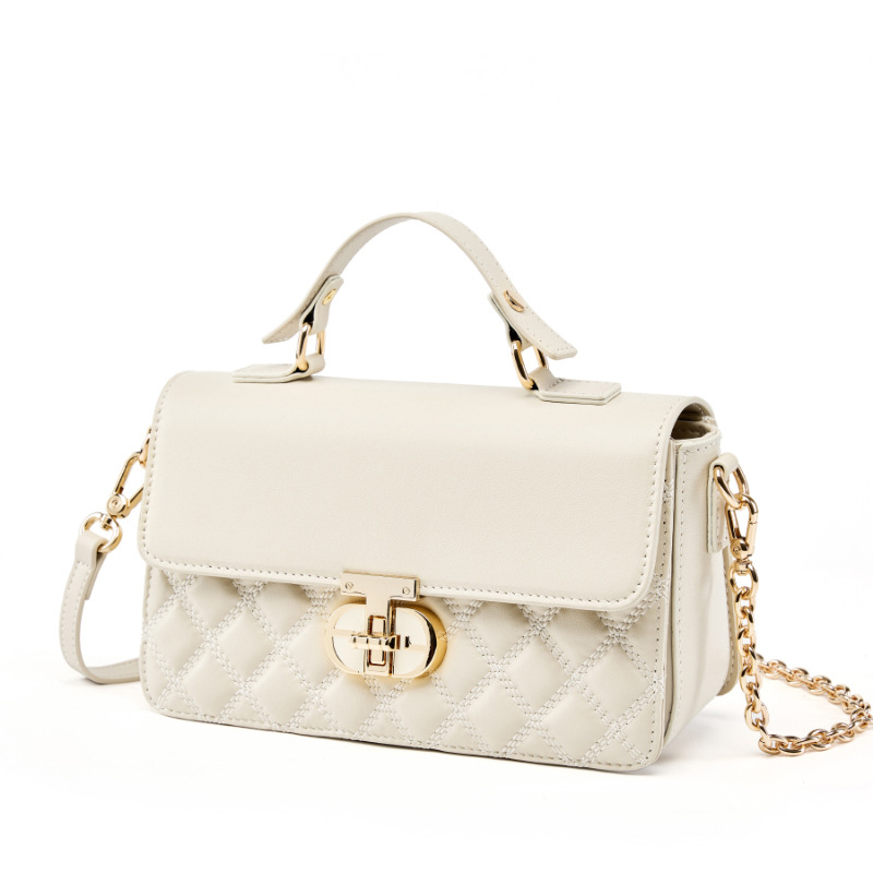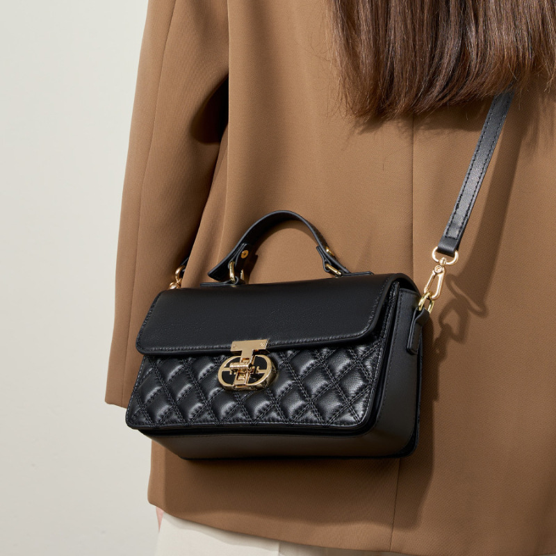 新款头层牛皮高级感小众设计时尚小香风手提菱格绣线真皮女包