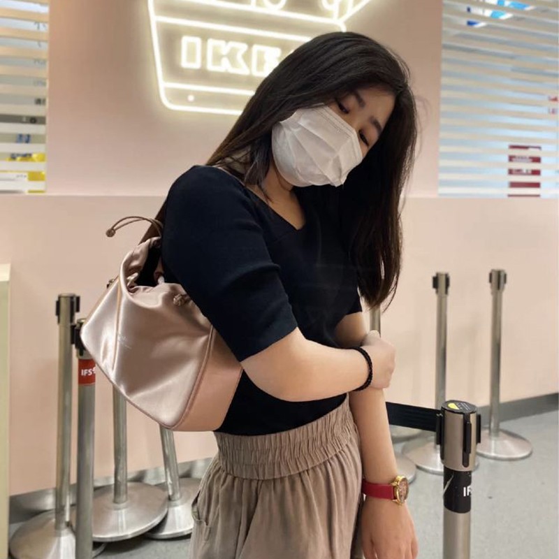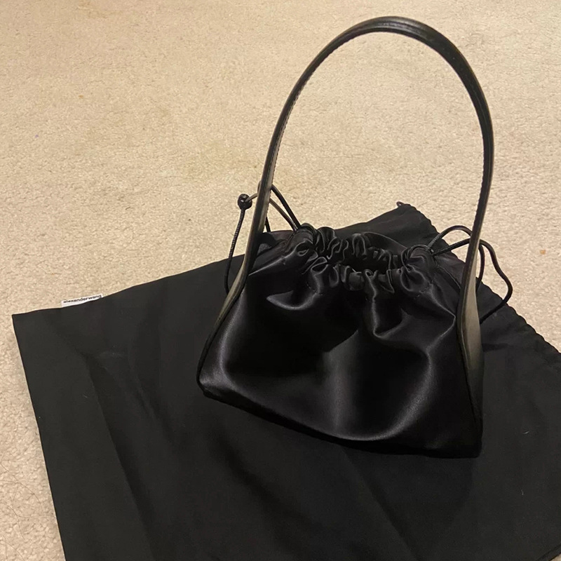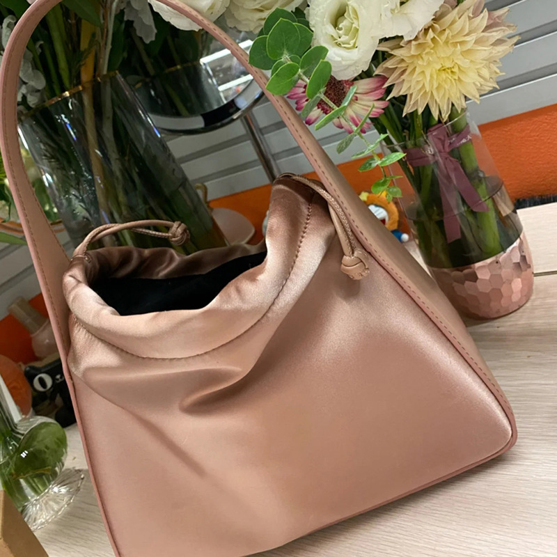 缎面拼皮手提包秋冬新款女包字母女士包包休闲抽绳腋下包