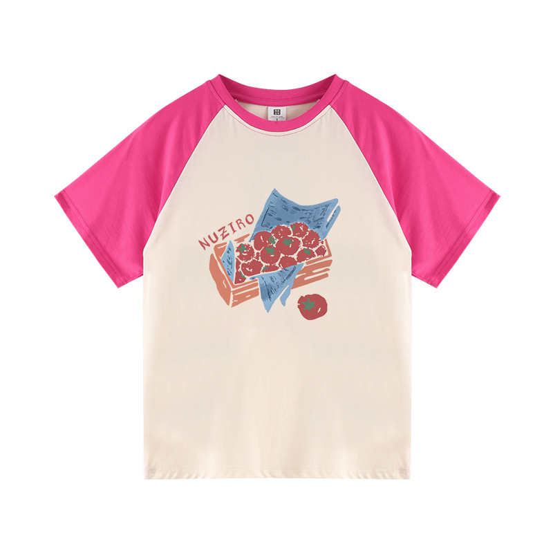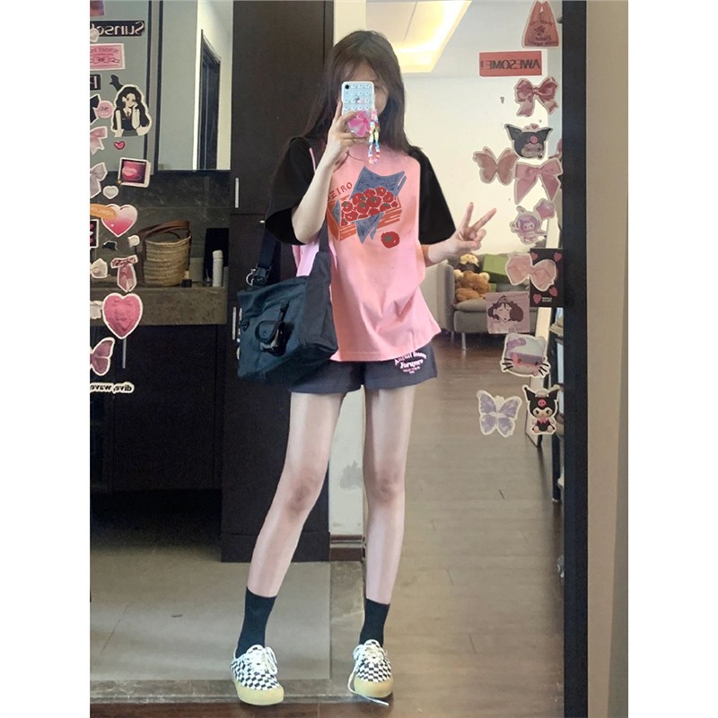 黑粉色插肩短袖t恤女夏季新款多巴胺穿搭大版宽松半袖上衣潮
