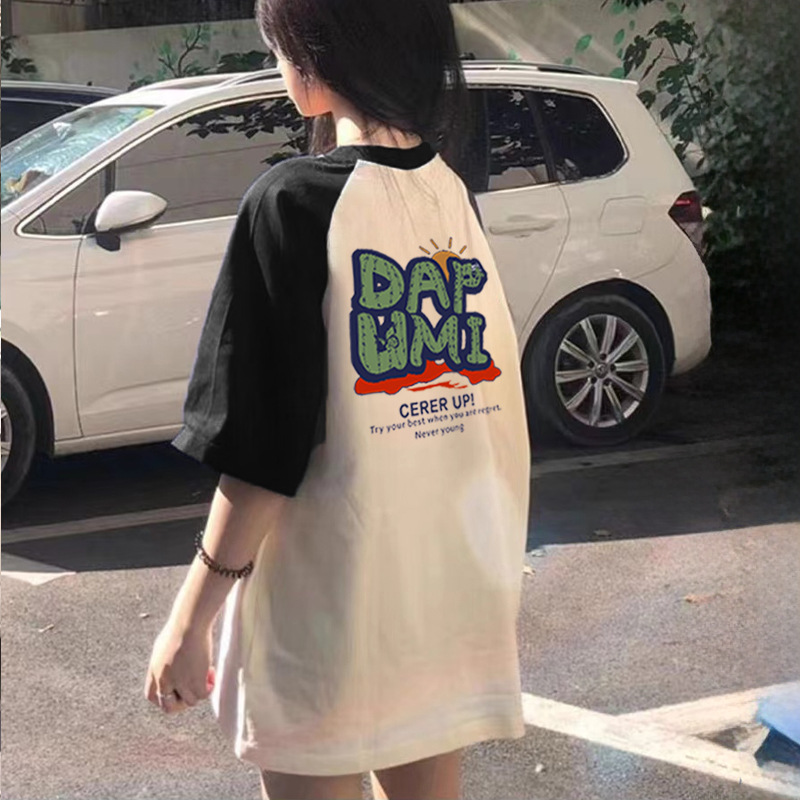 欧货新款插肩拼接撞色短袖T恤女夏中长款大版纯棉遮屁股印花上衣