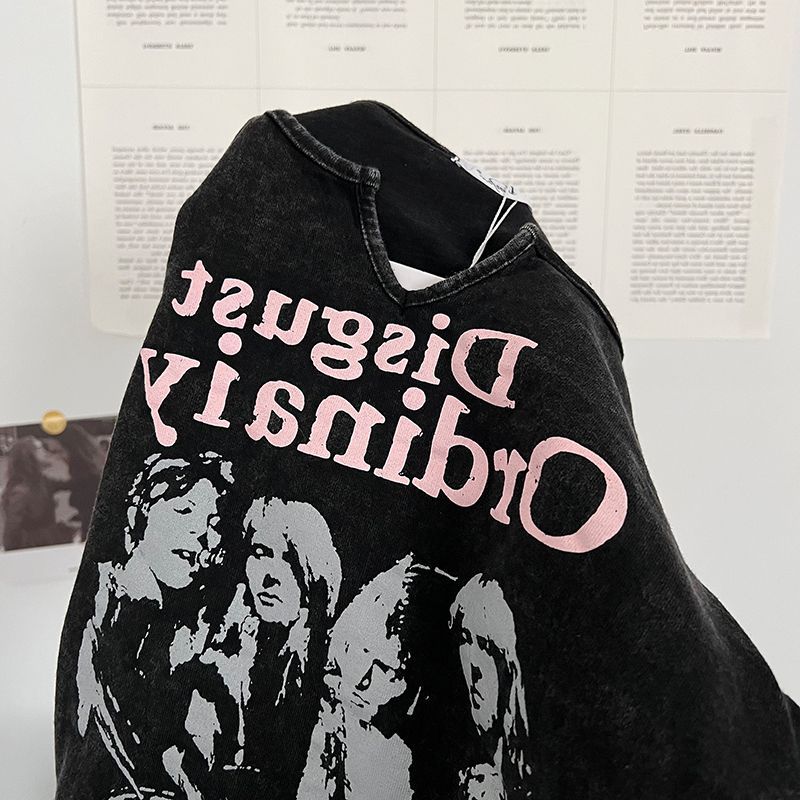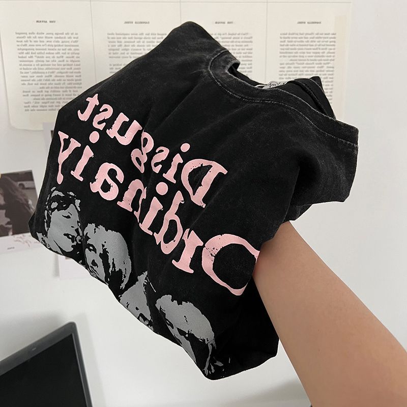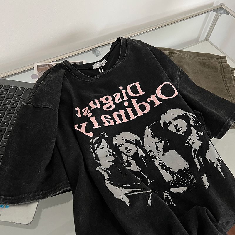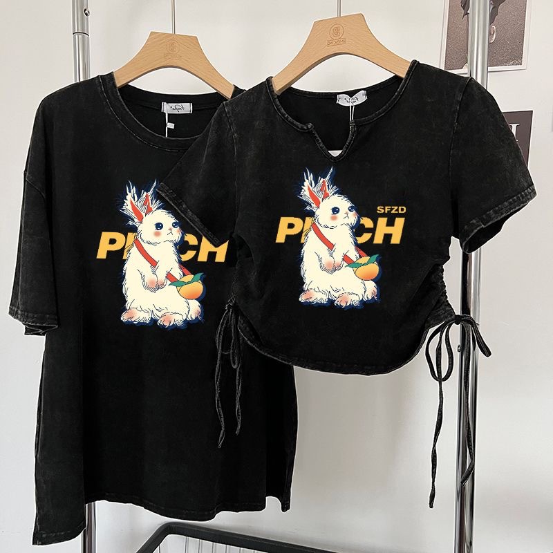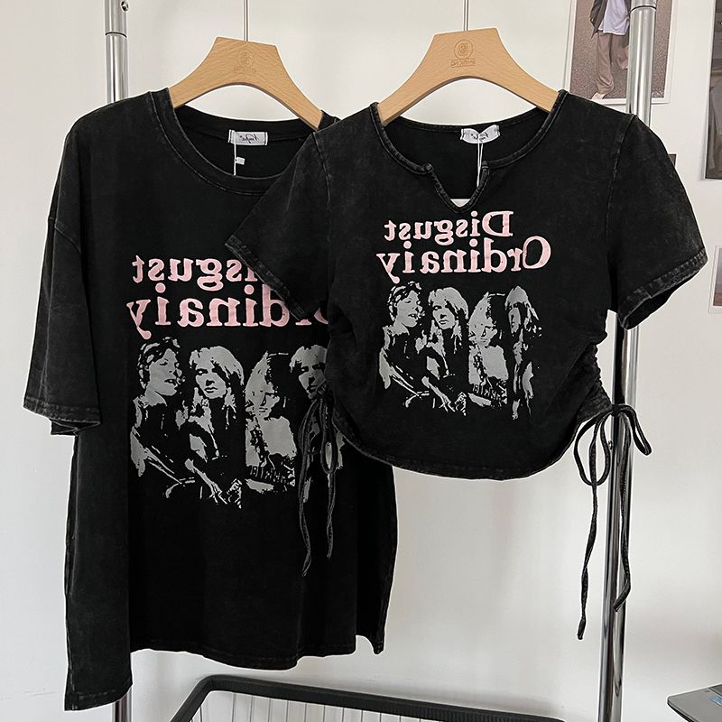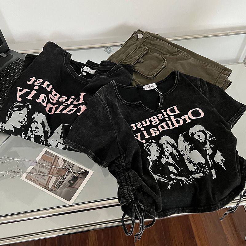 美式复古洗水做旧T恤女设计感小众抽绳短款辣妹上衣情侣装短袖潮