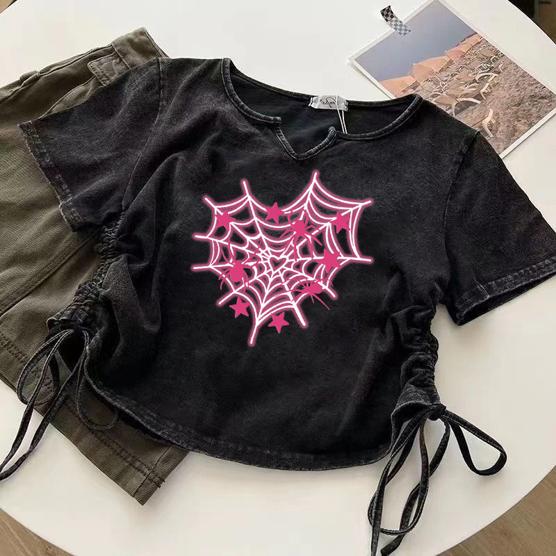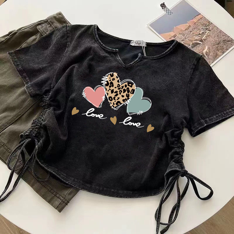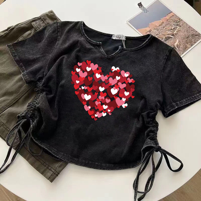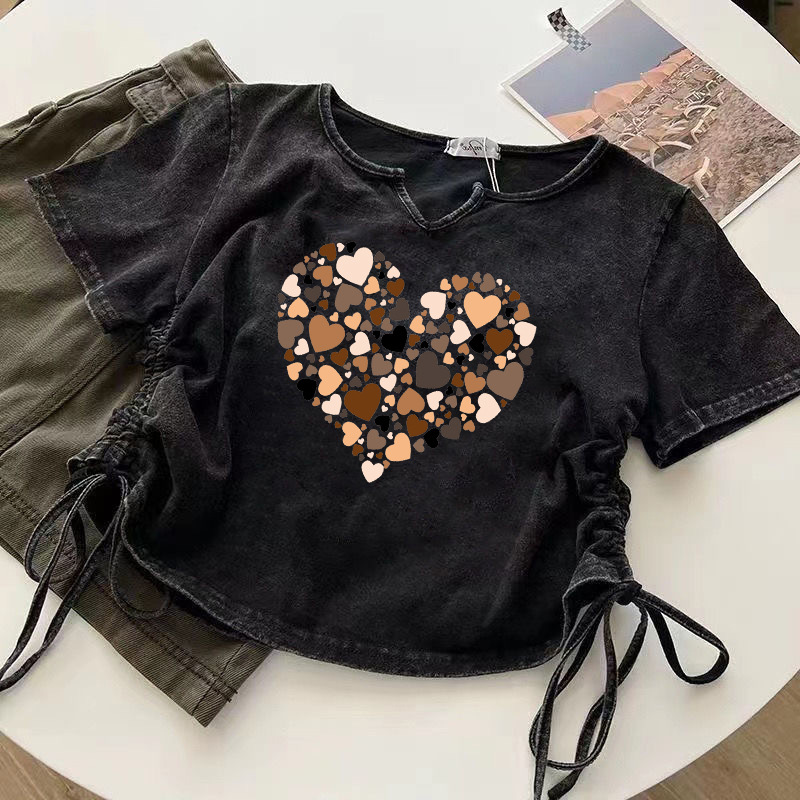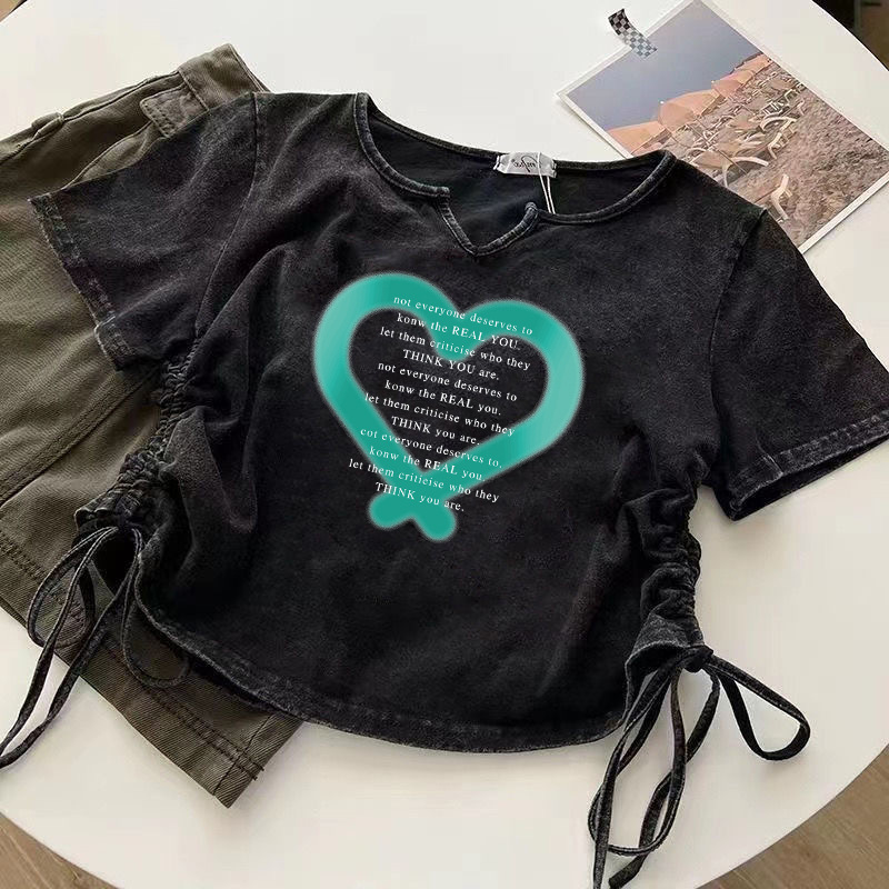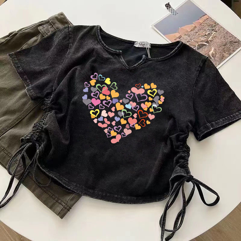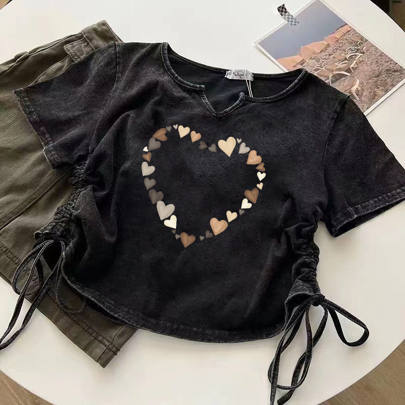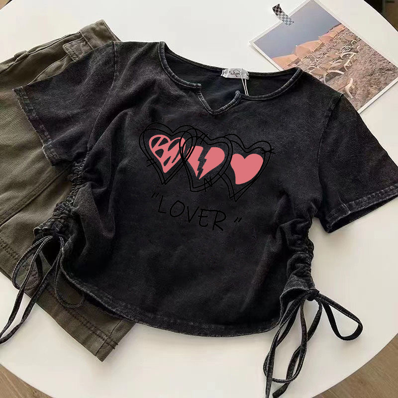 设计感爱心印花水洗黑做旧t恤女夏季短款抽绳小众百搭上衣情侣装
