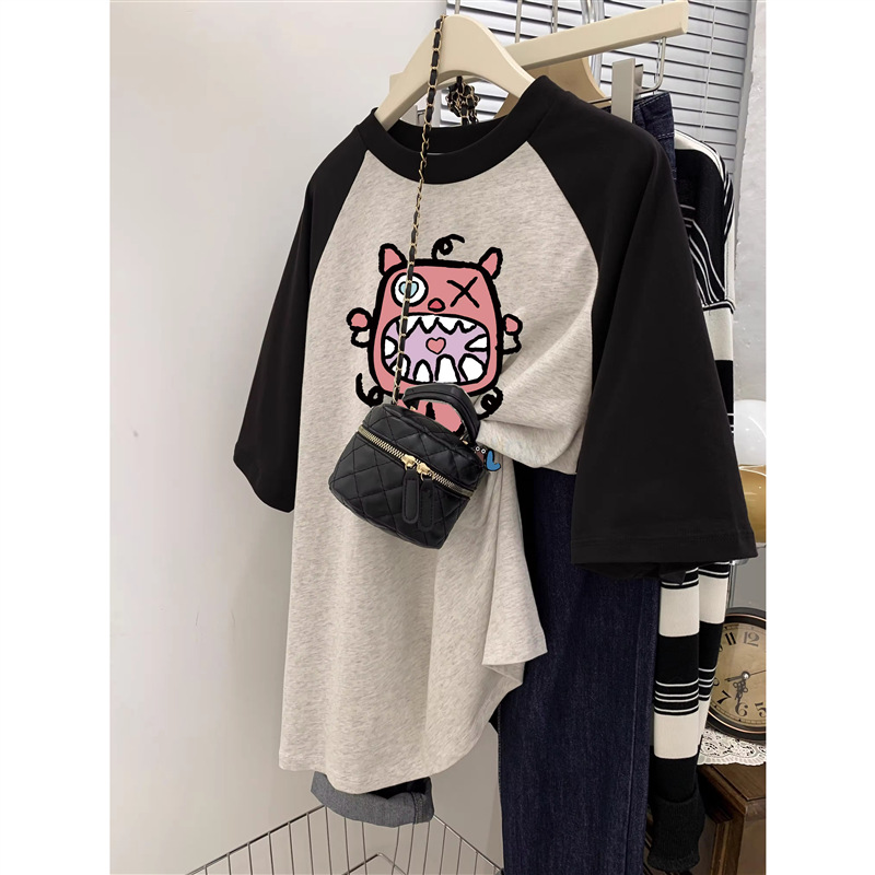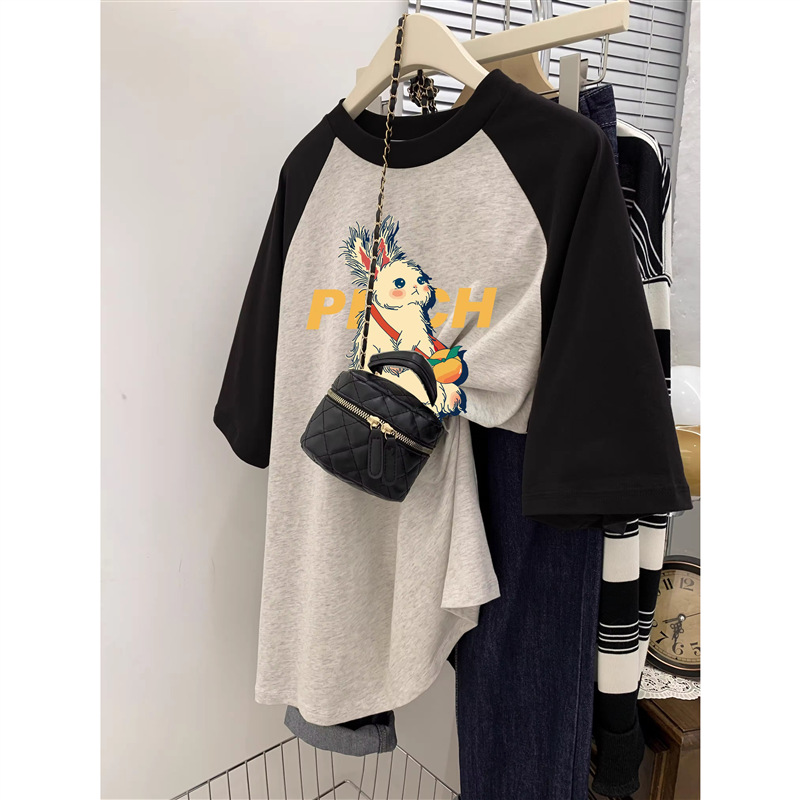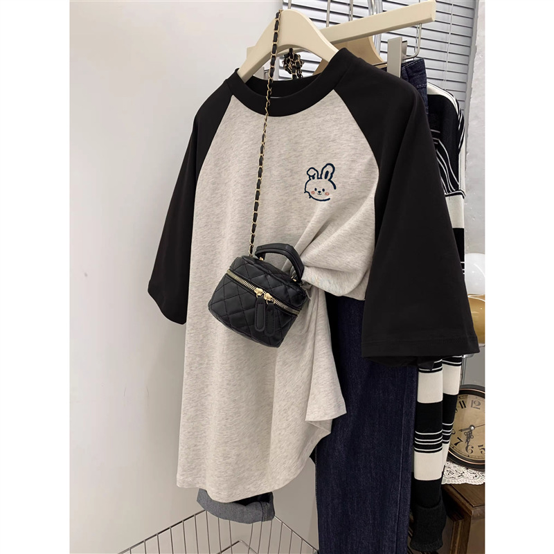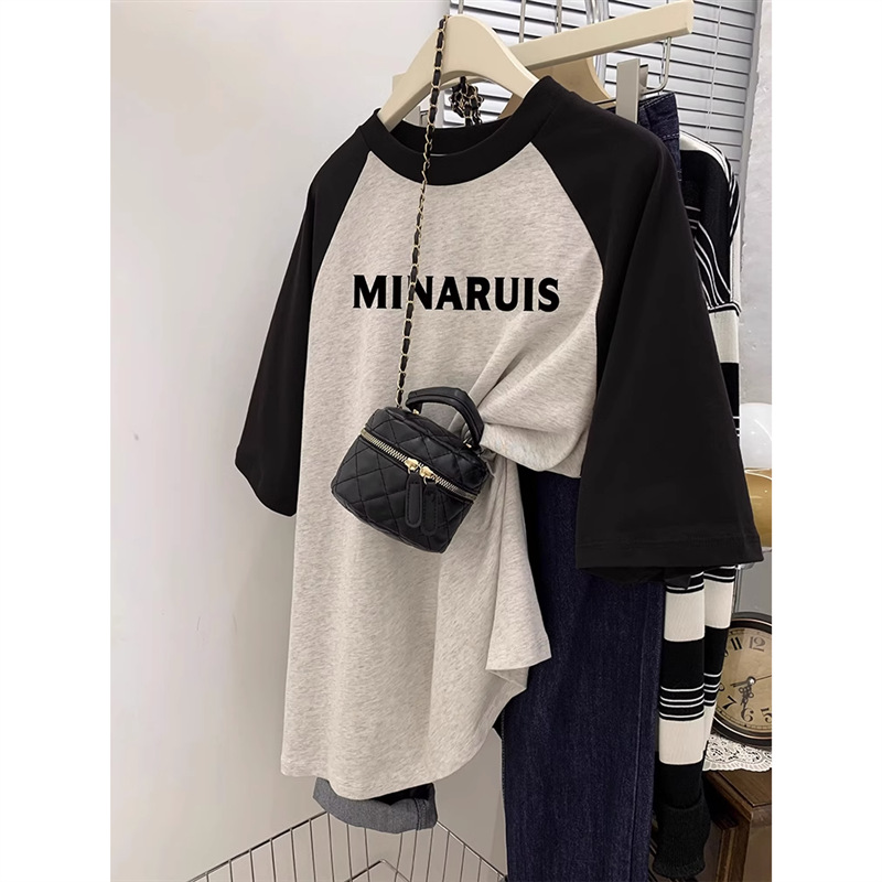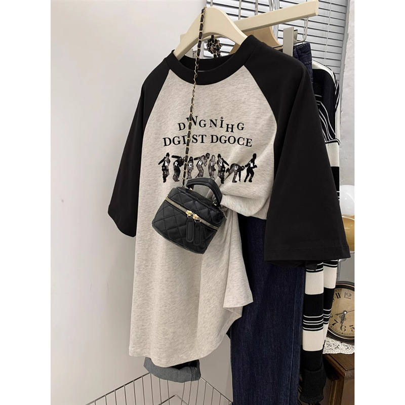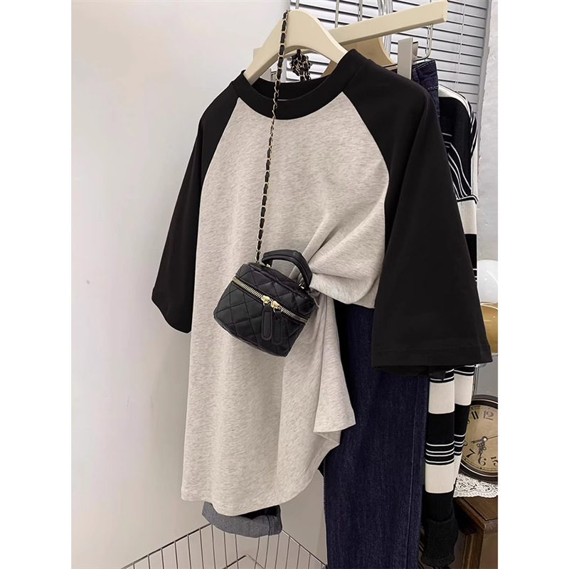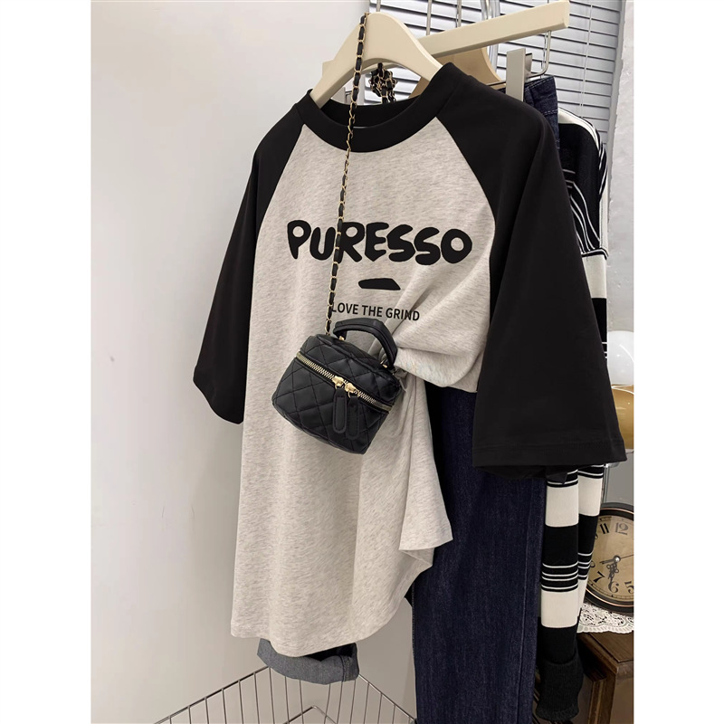 灰色短袖T恤女春薄款美式复古宽松大码胖mm插肩袖纯棉半袖上衣ins