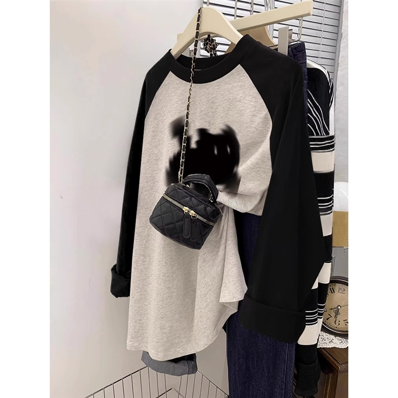 - 黑拼白灰-线条字母长袖