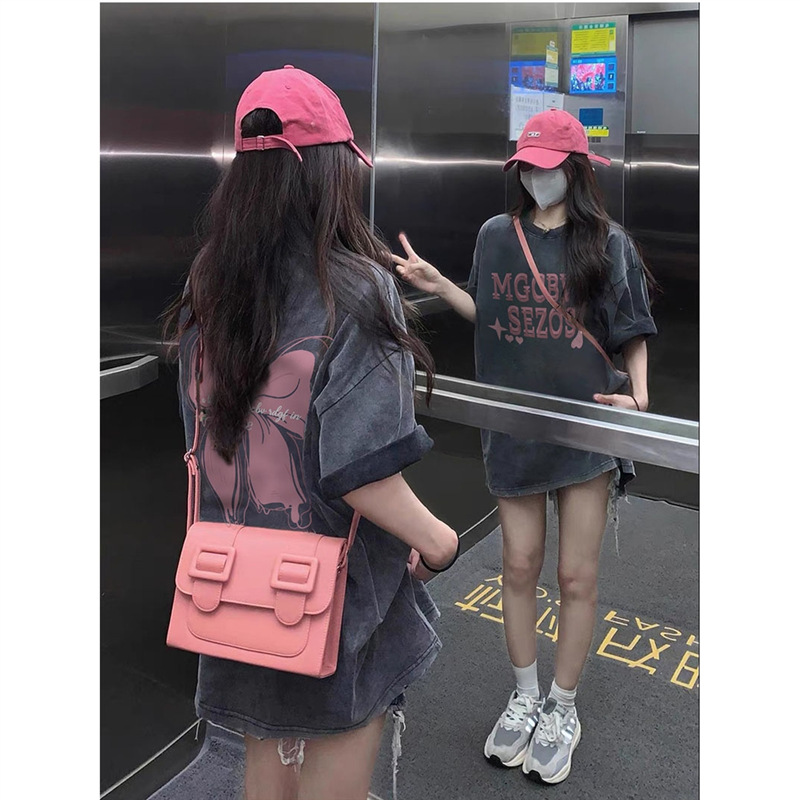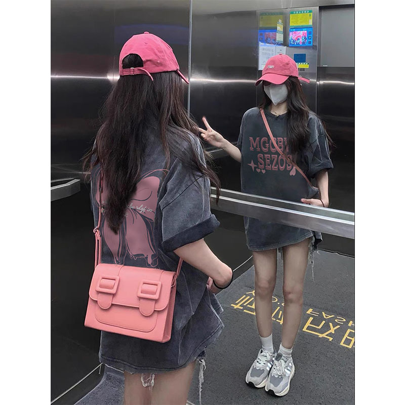 美式水洗做旧正肩短袖t恤女夏季设计感小众港味复古chic上衣情侣