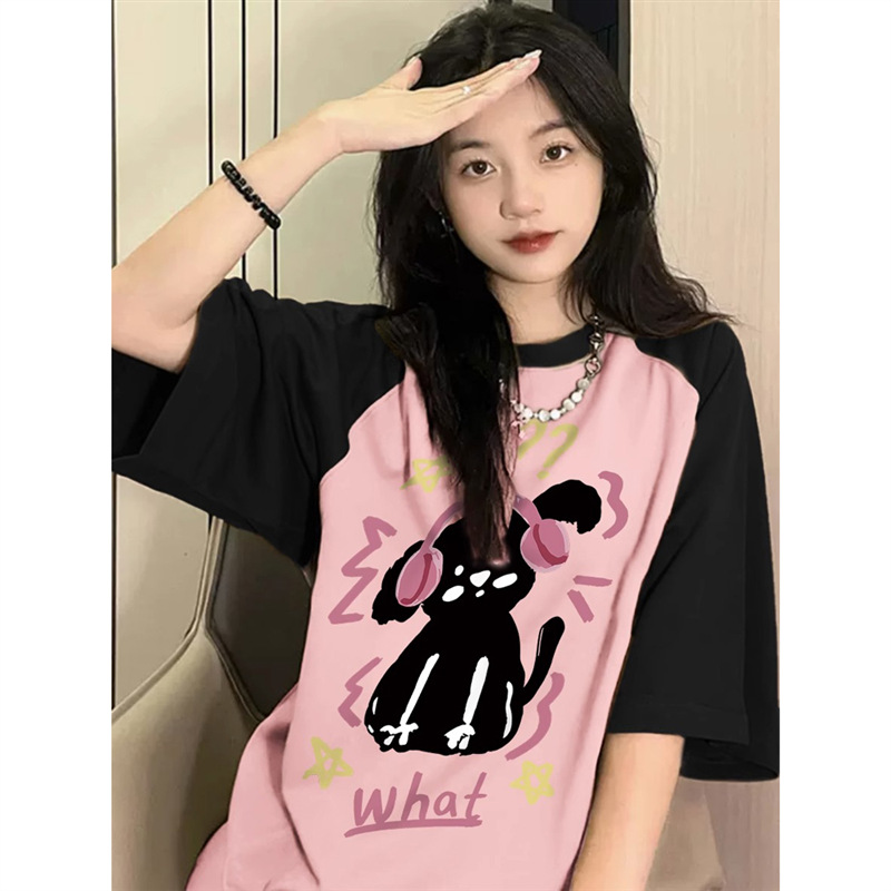 美式复古撞色正肩短袖t恤女夏季新款设计感小众大版插肩上衣
