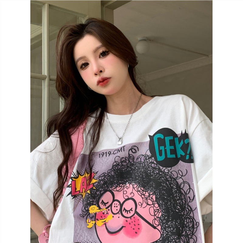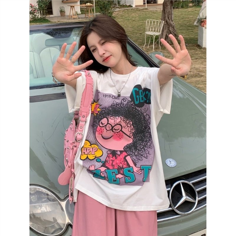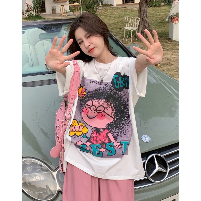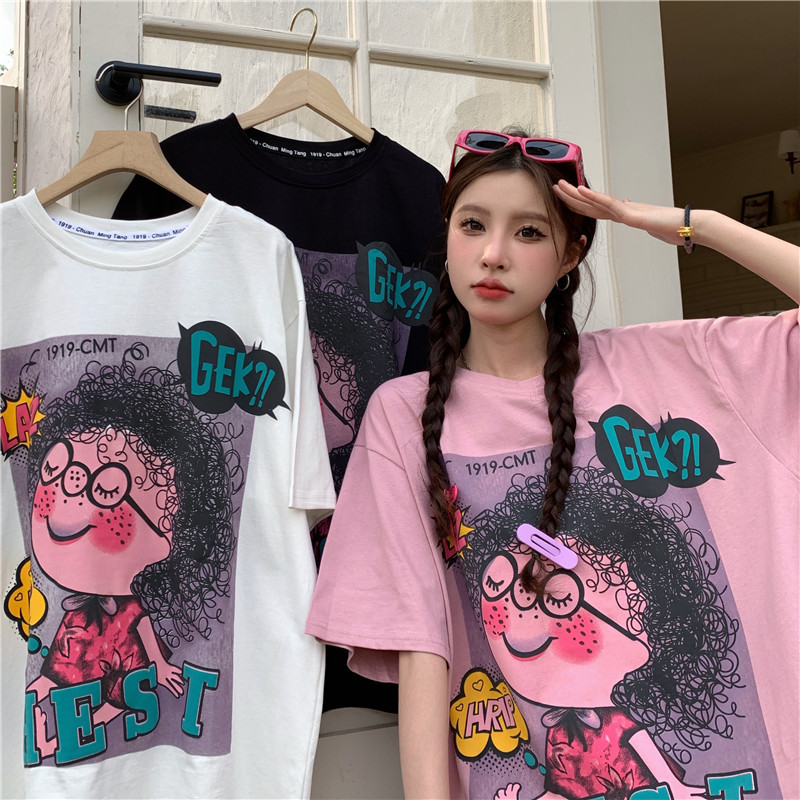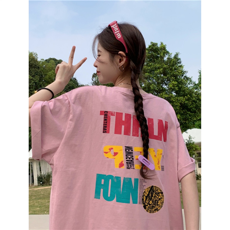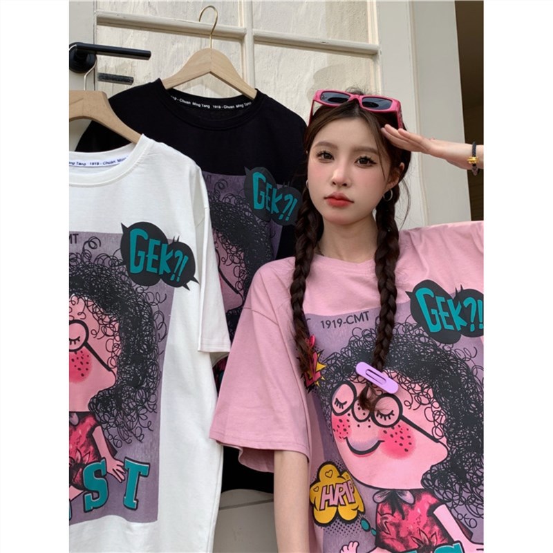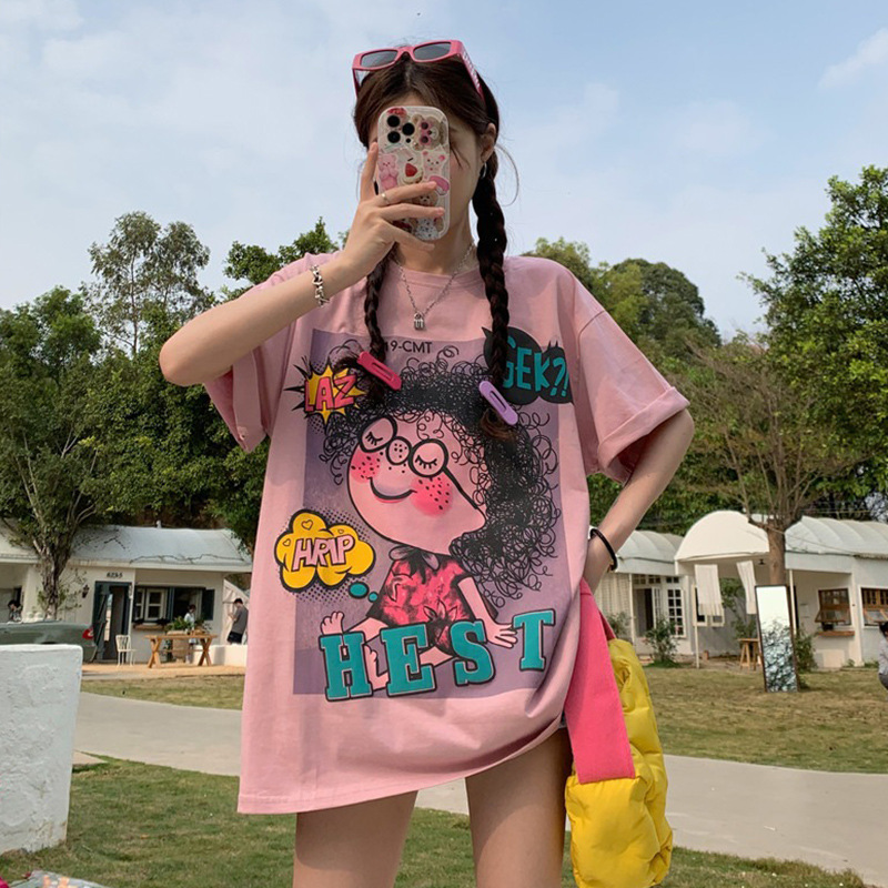 卡通印花美式复古粉色短袖t恤女夏中长款宽松慵懒风下衣失踪半袖