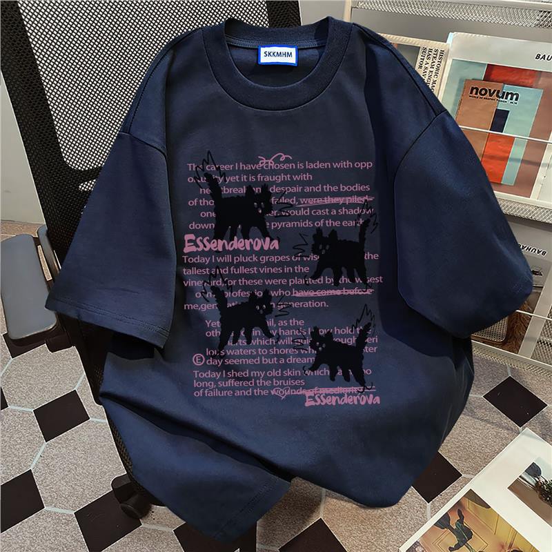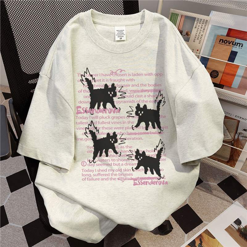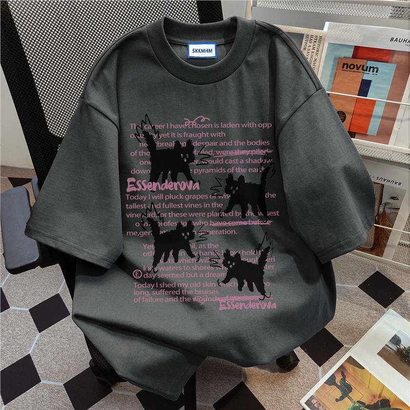 重磅纯棉美式高街小猫印花短袖T恤女夏季宽松休闲设计感小众上衣