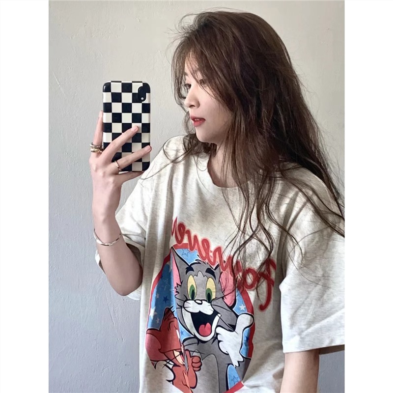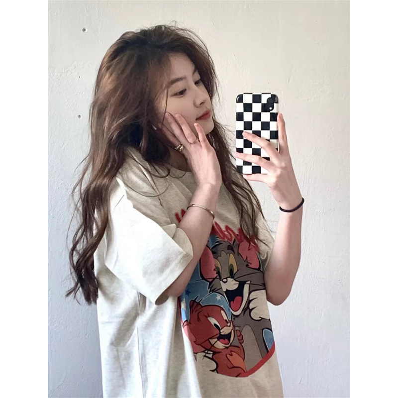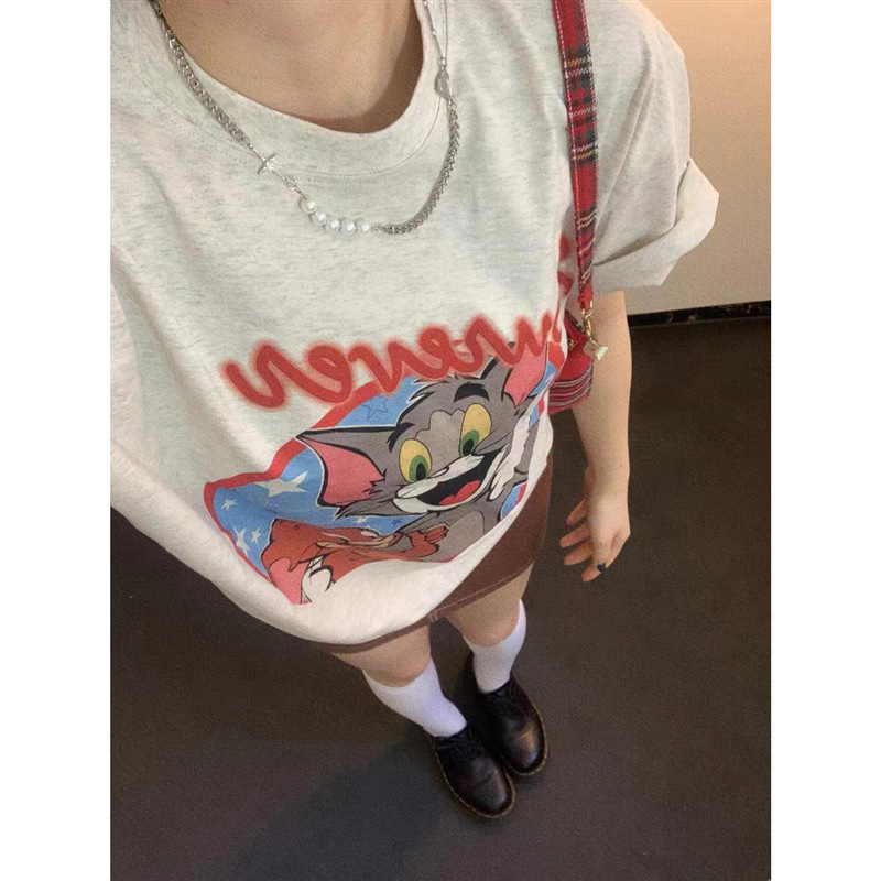 美式复古纯棉别致设计感卡通汤姆与杰瑞圆领t恤短袖宽松上衣女ins