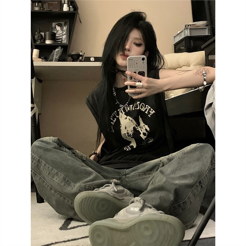 美式复古背心女夏季水洗做旧潮牌宽松情侣装无袖背带印花上衣