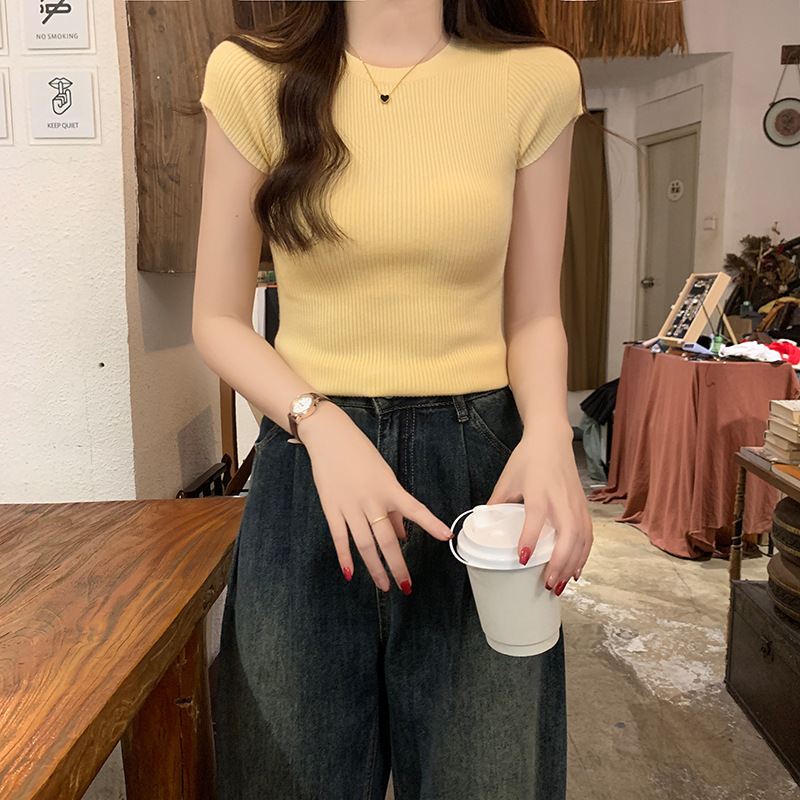 黄色短袖针织t恤女夏季新款爆款小飞袖修身正肩短款早春上衣