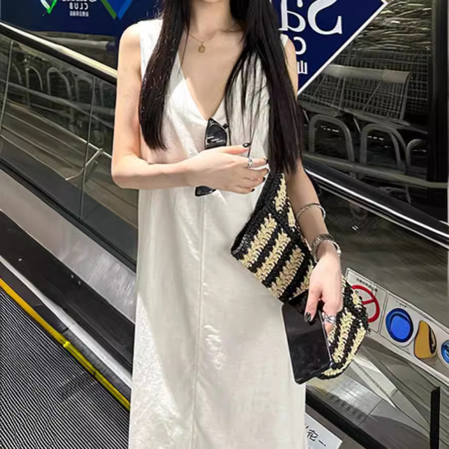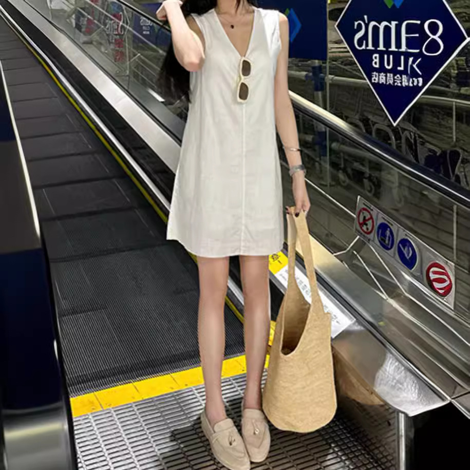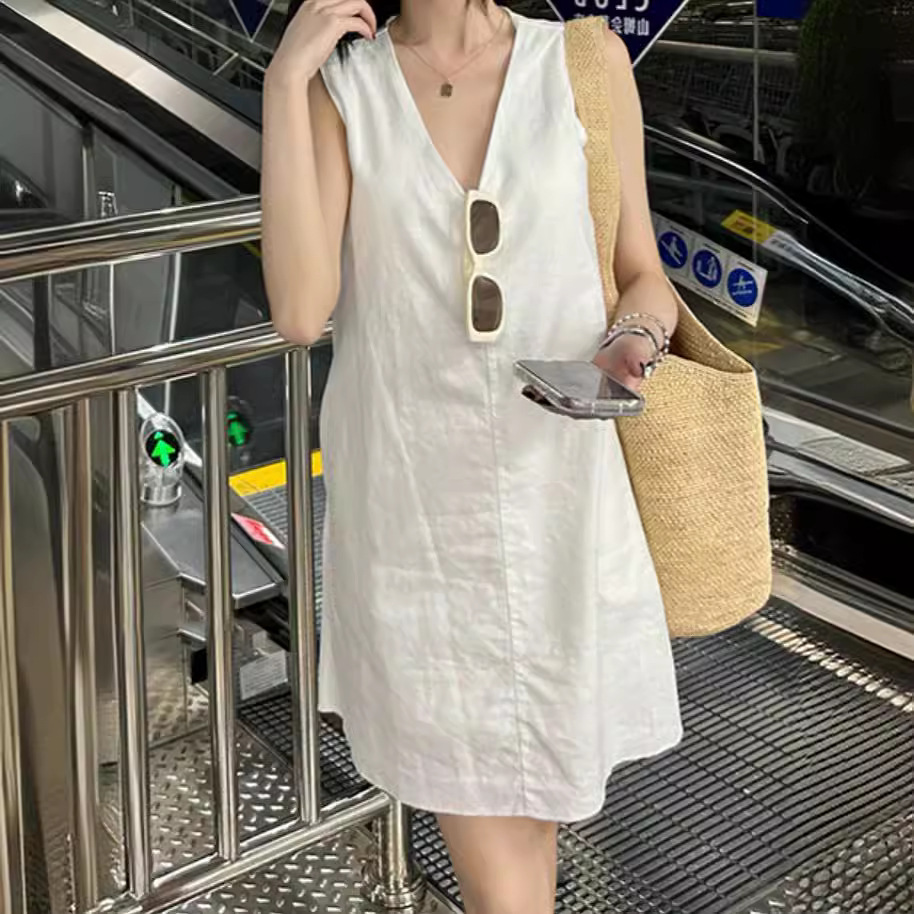 白色亚麻连衣裙女夏日小众温柔舒适清爽简约显瘦V领长裙遛弯度假