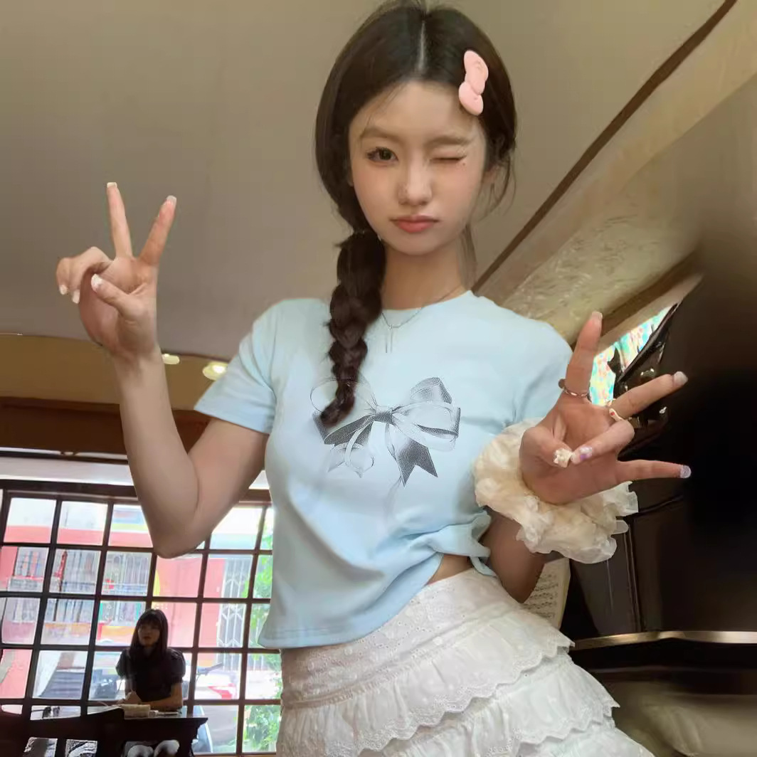 纯棉蝴蝶结印花圆领短袖T恤女夏季小个子短款修身chic甜辣小上衣