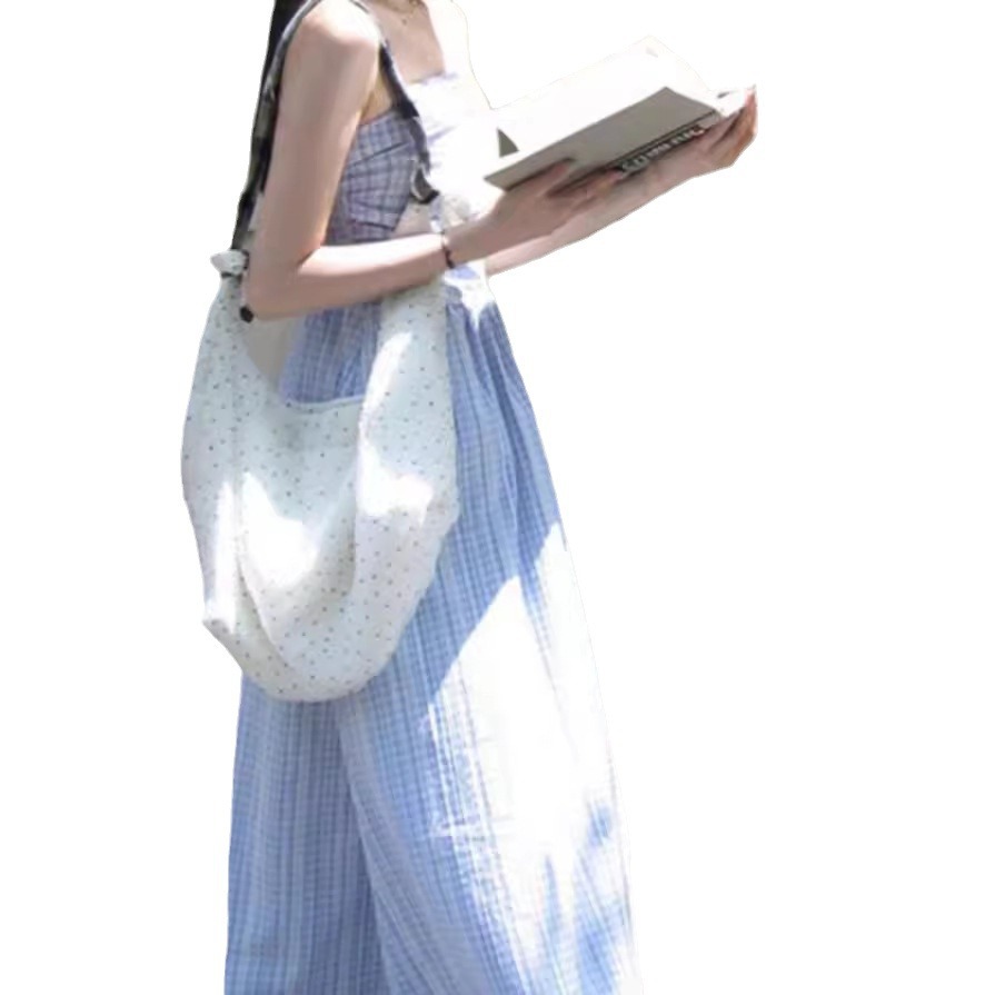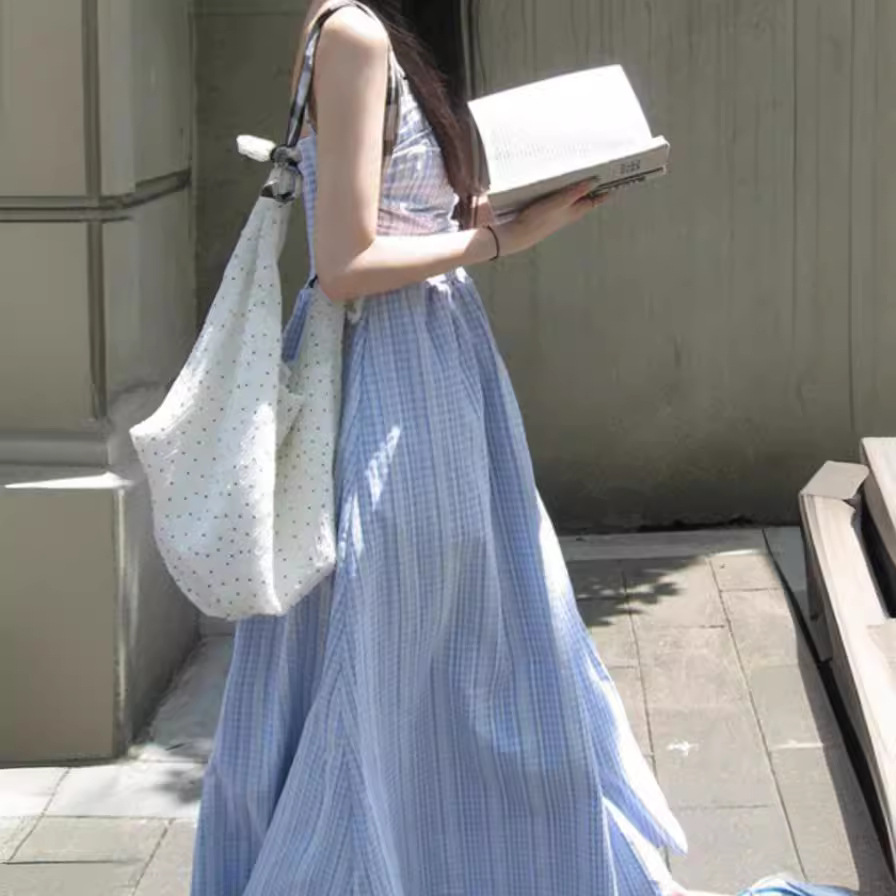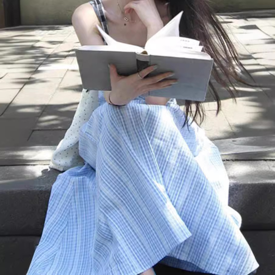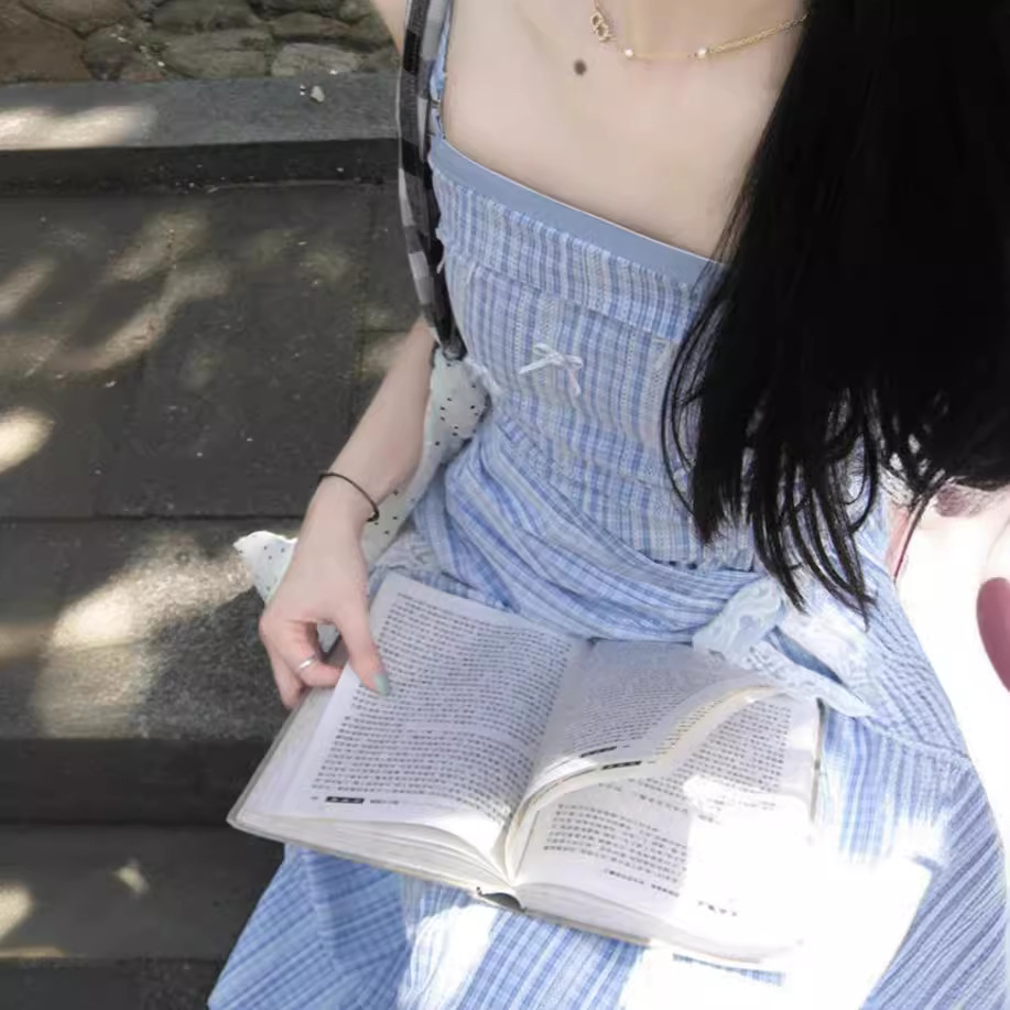 "小岛邂逅"蓝色格纹蕾丝显瘦高级感气质大气可拆卸吊带抹胸长裙女