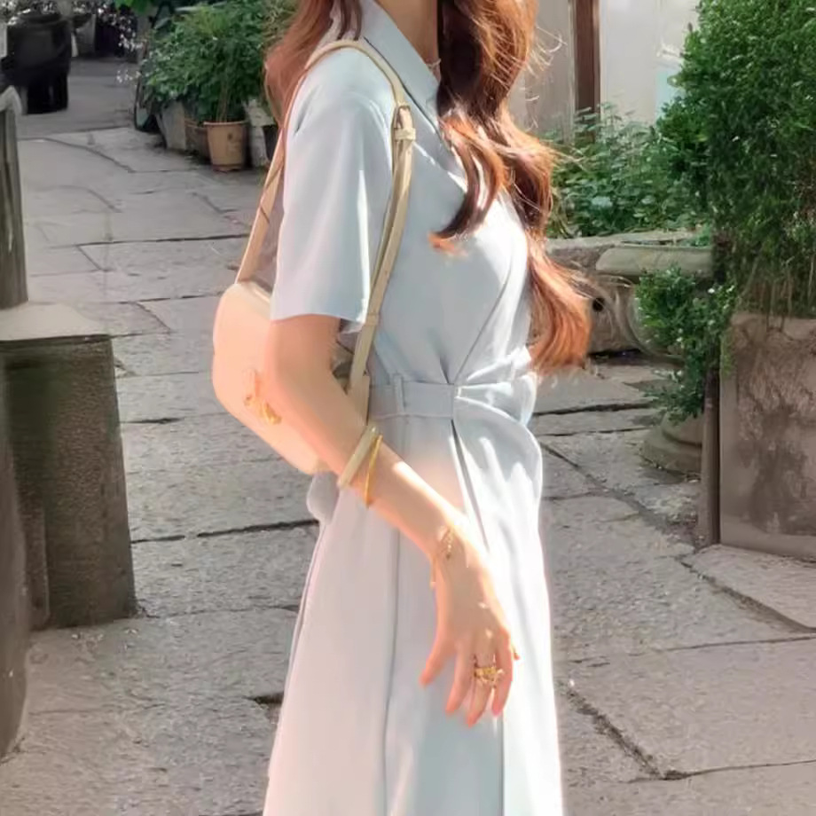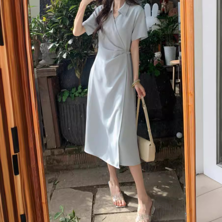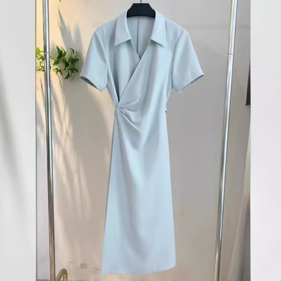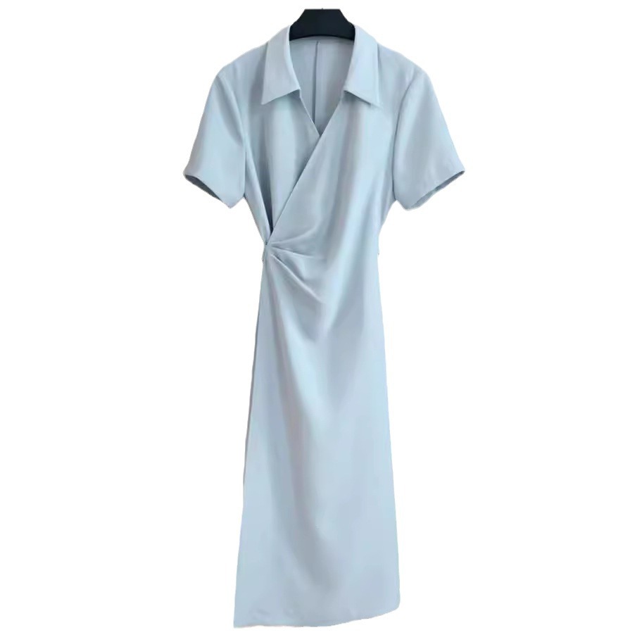 【蓝色大海】夏季简约设计感小众翻领褶皱舒适气质显瘦连衣裙