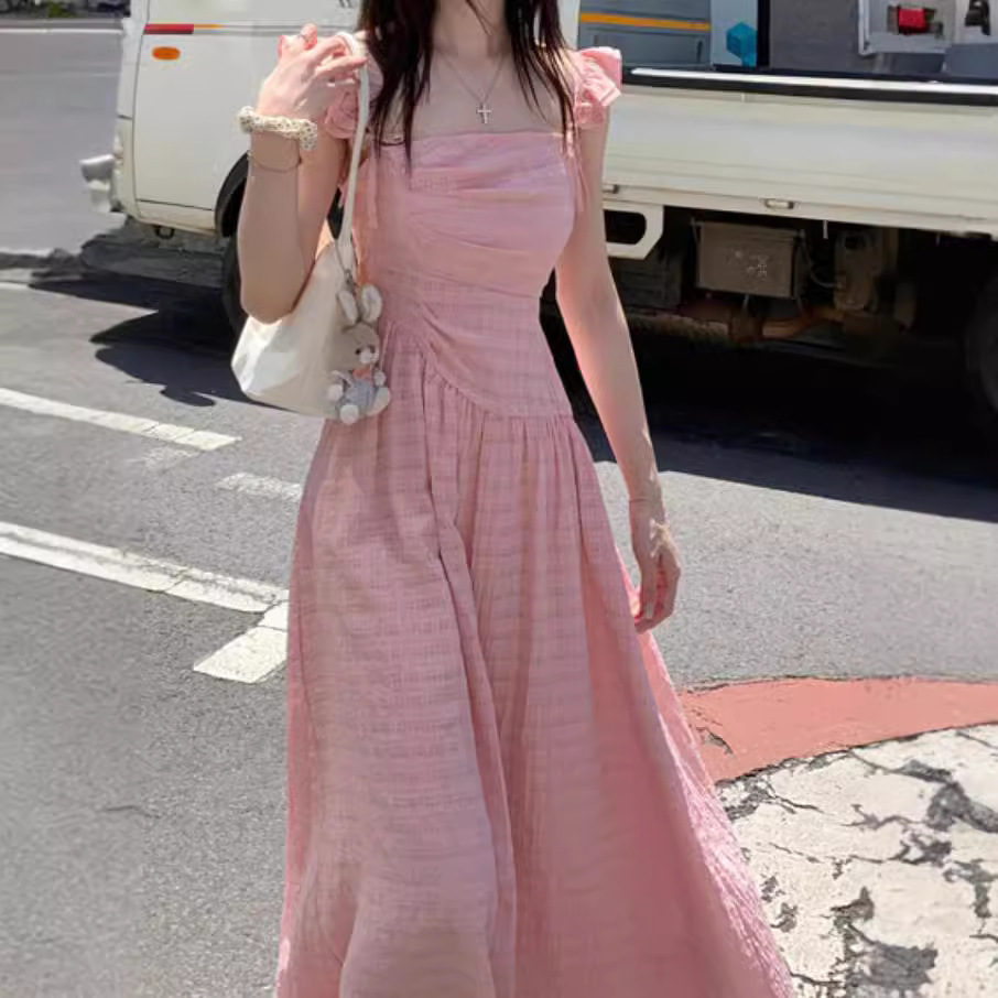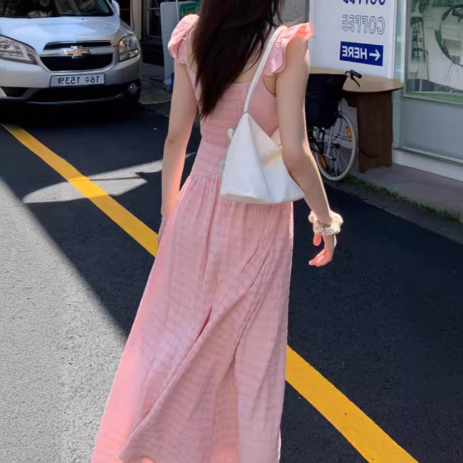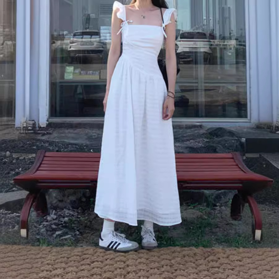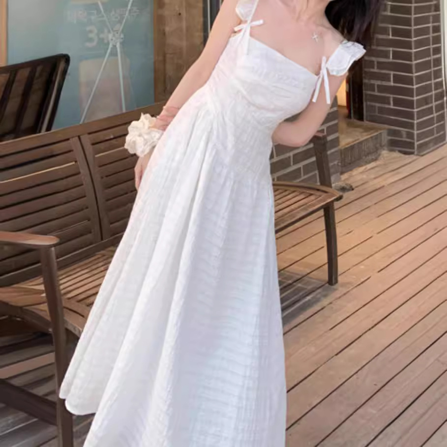 长裙女夏季法式甜美收腰修身小众温柔舒适方领小飞袖白色连衣裙