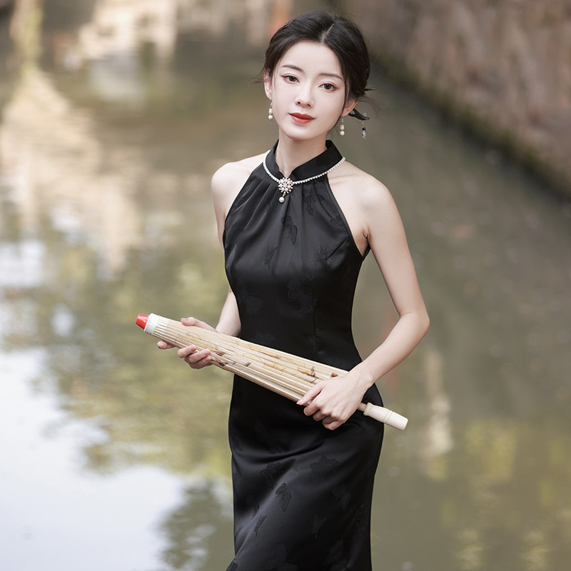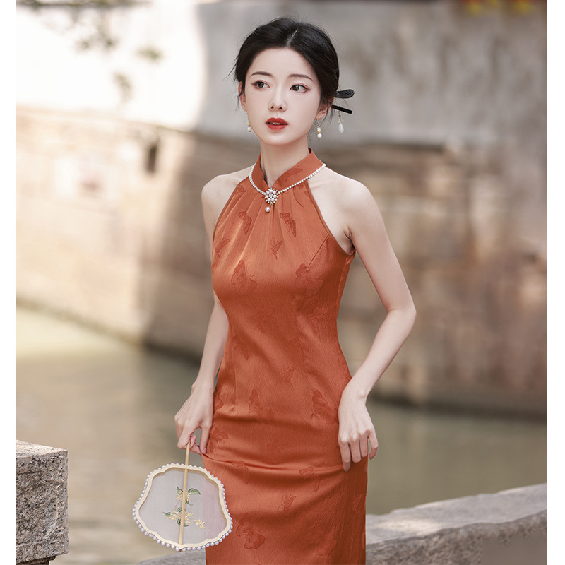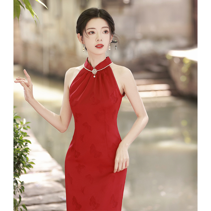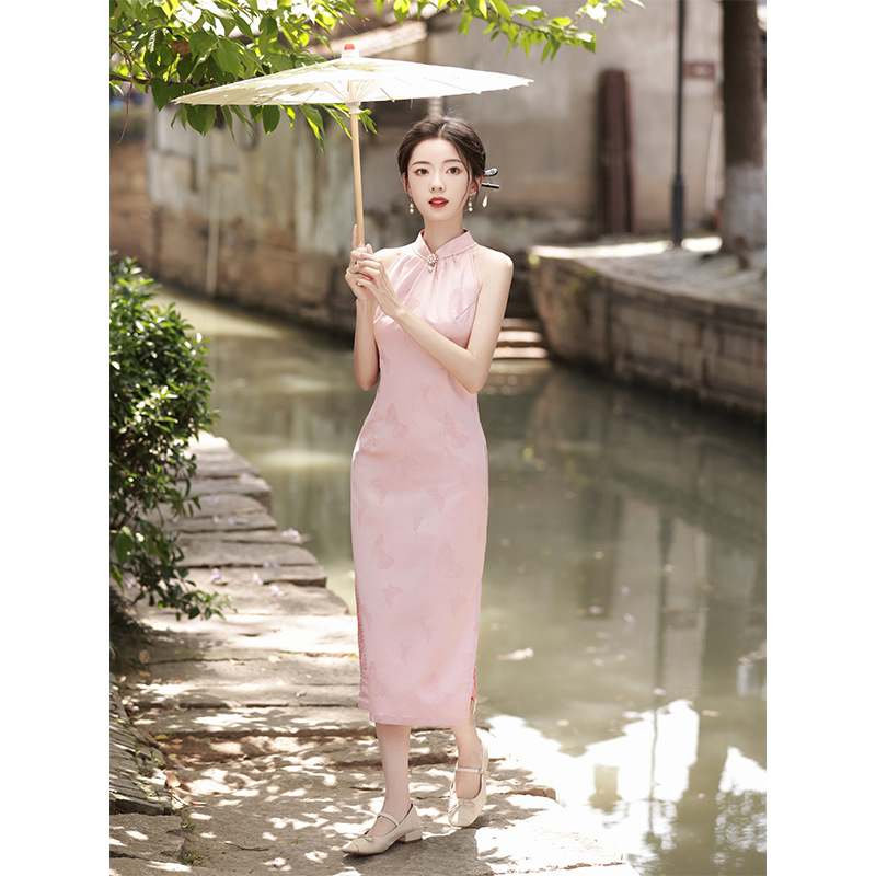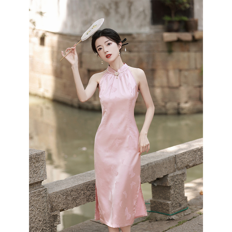 粉色旗袍女新款高端改良年轻款少女新中式挂脖露肩日常连衣裙