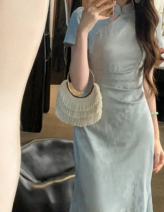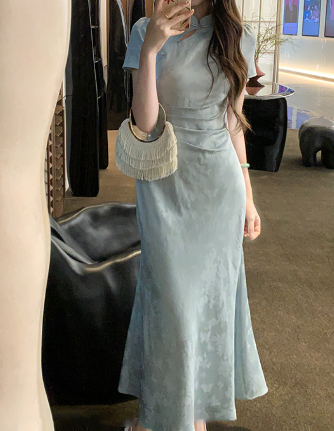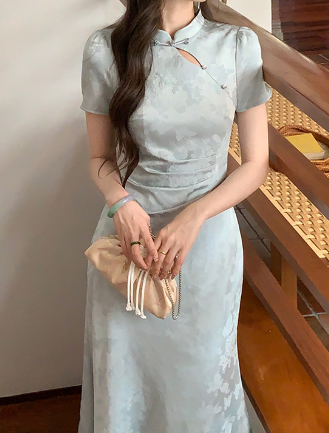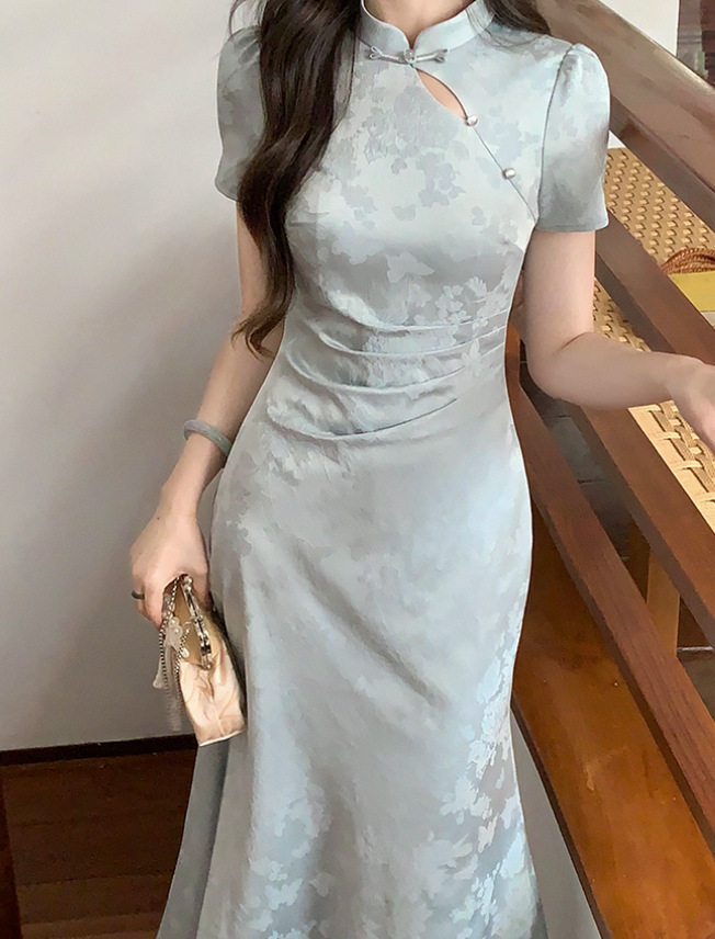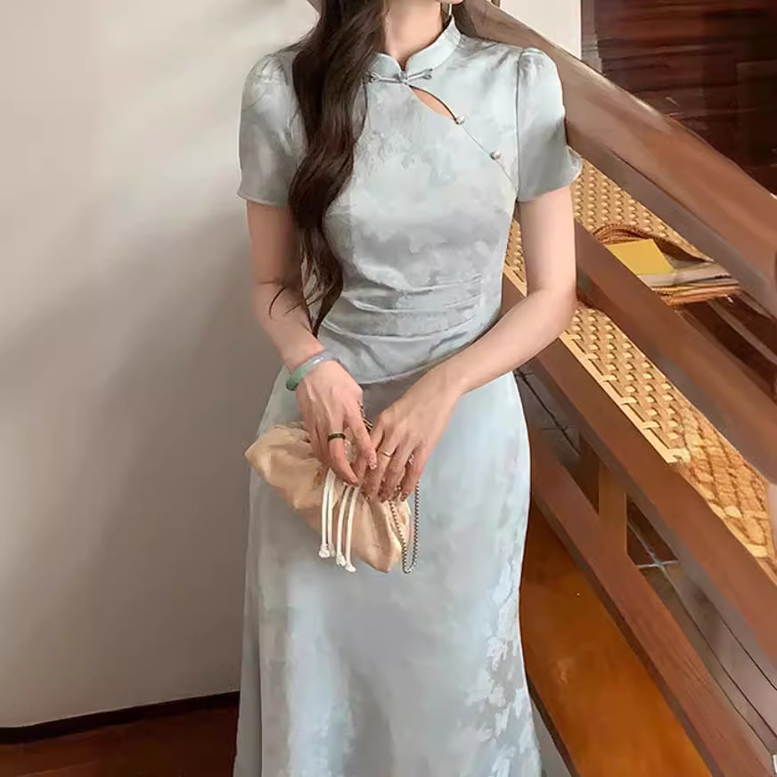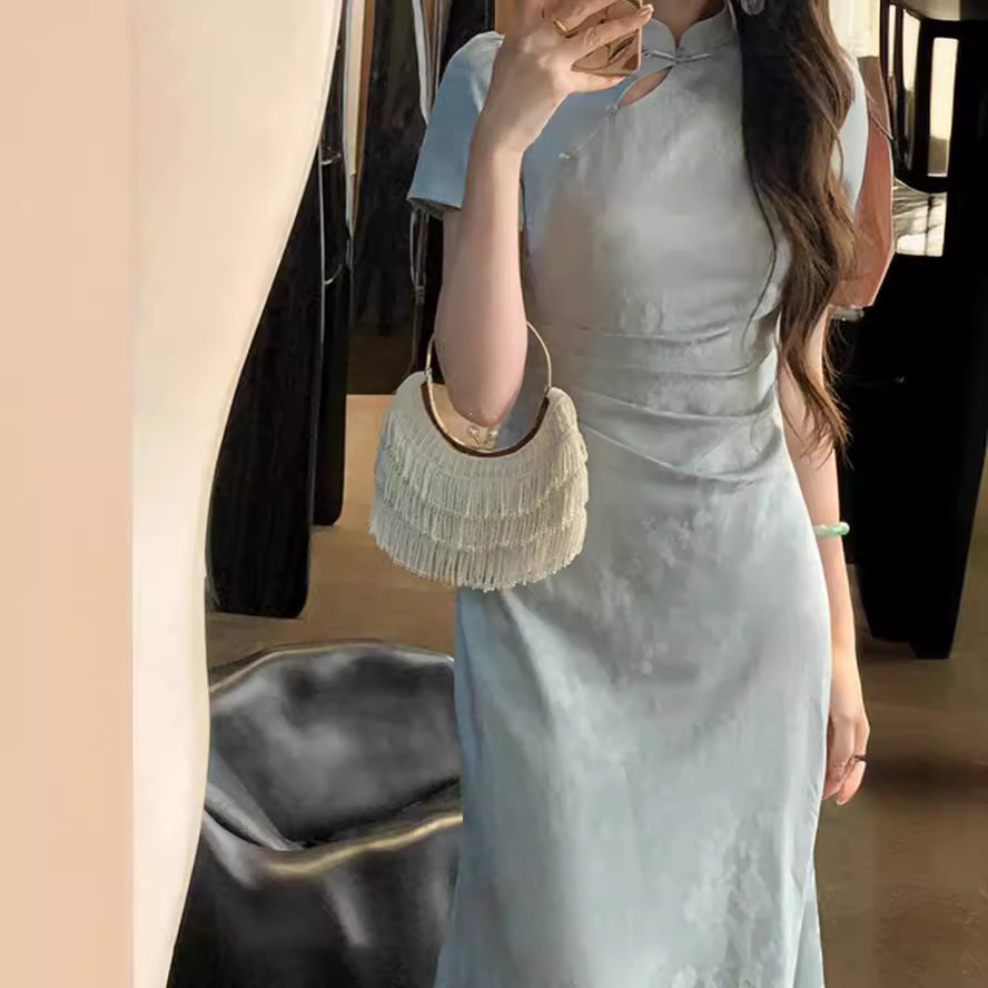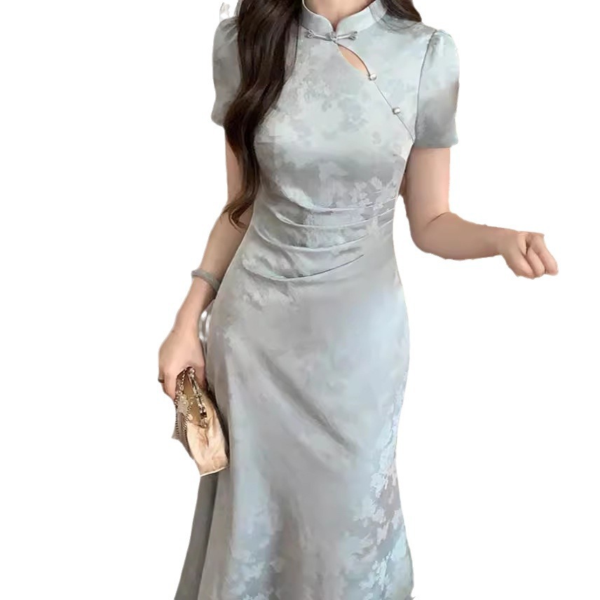 新中式复古改良小众温柔舒适气质旗袍女夏季暗纹提花短袖连衣裙