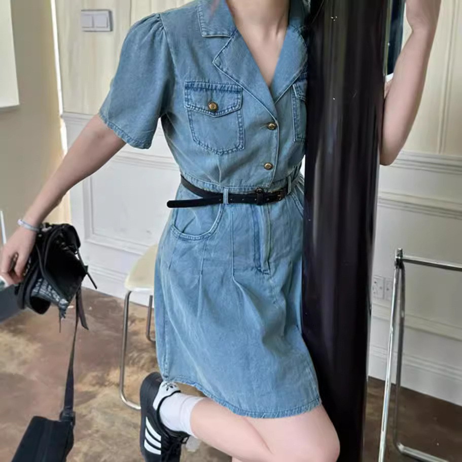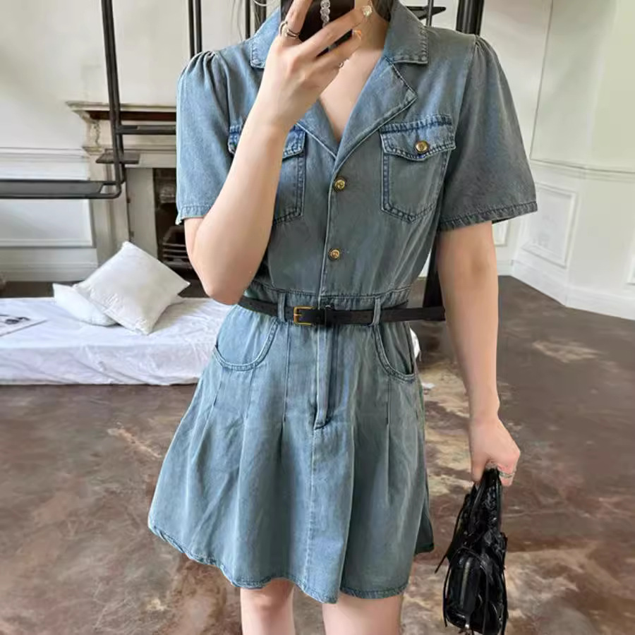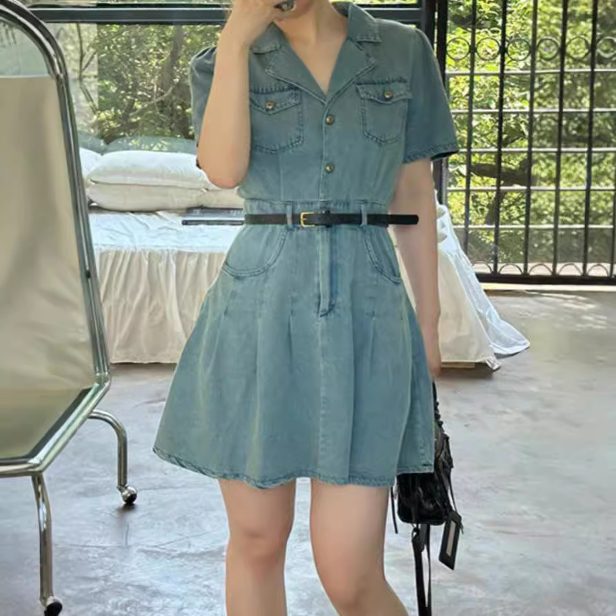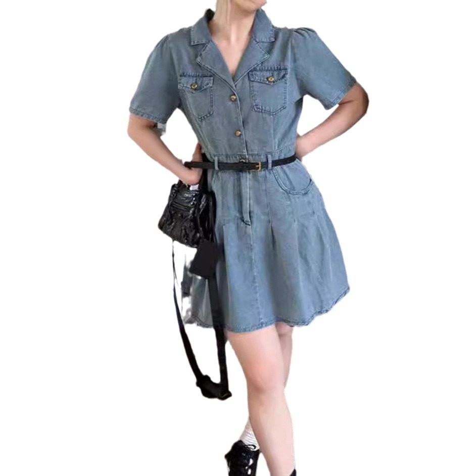 胖MM收腰短袖牛仔连衣裙早秋新款小众温柔高腰显瘦A字短裙